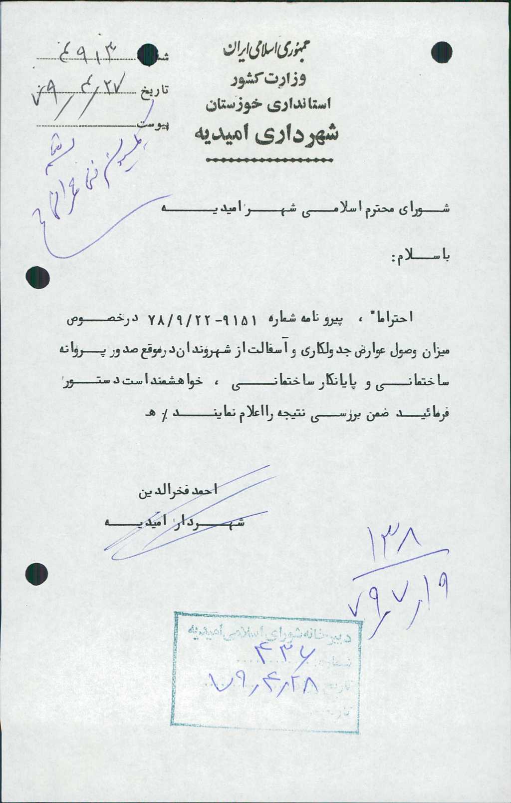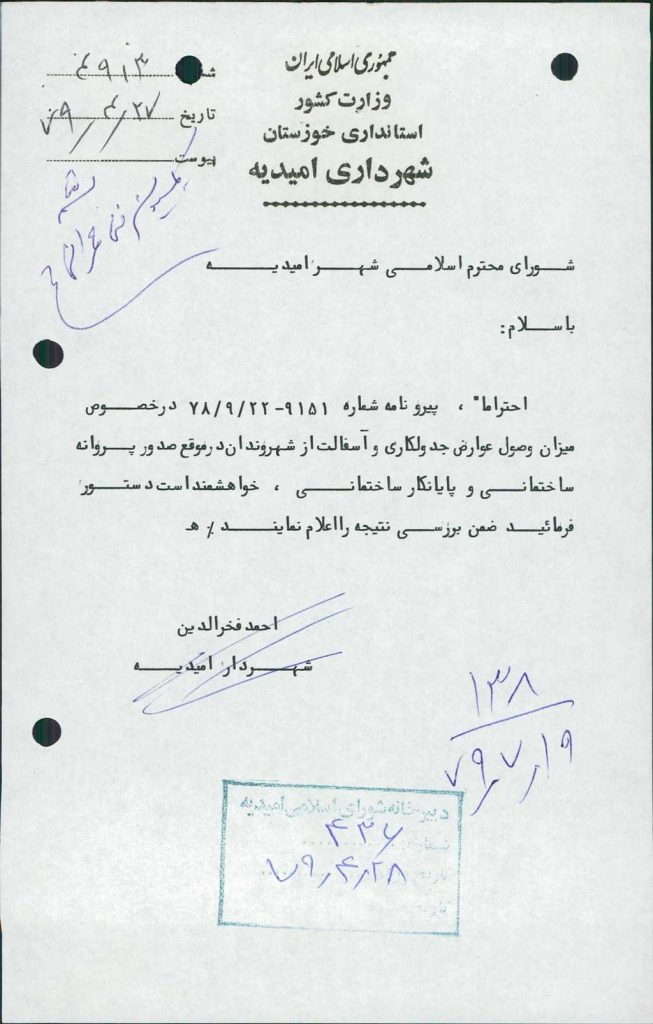 ۸-نامه شماره ۴۹۱۳ مورخه ۲۷/ ۴/ ۷۹ شهرداري در خصوص وصول عوارض جدولكاري و آسفالت از شهروندان در موقع صدور پروانه ساختماني و پايانكار ساختماني بررسي و مقرر گرديد نرخهاي پيشنهادي طي نامه اي جهت اقدام به شهرداري ابلاغ گردد.