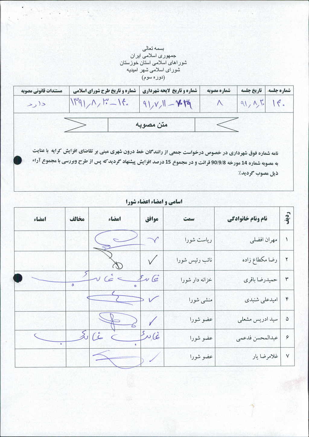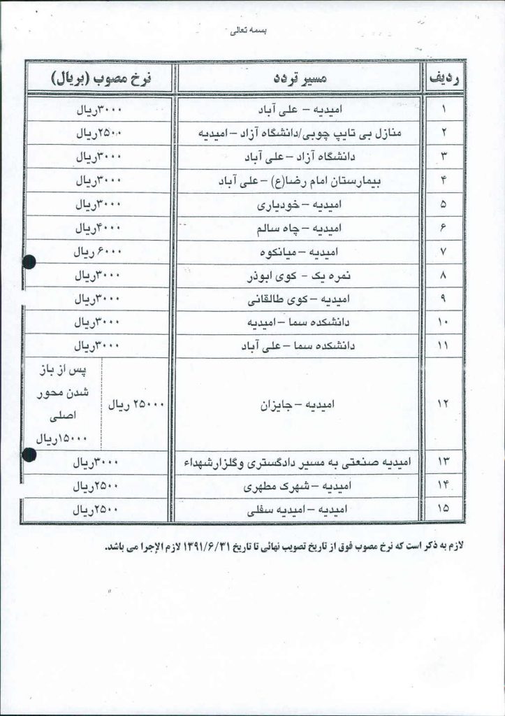 مصوبه شماره ۸ جلسه شماره ۱۴۰ شورای اسلامی شهر امیدیه