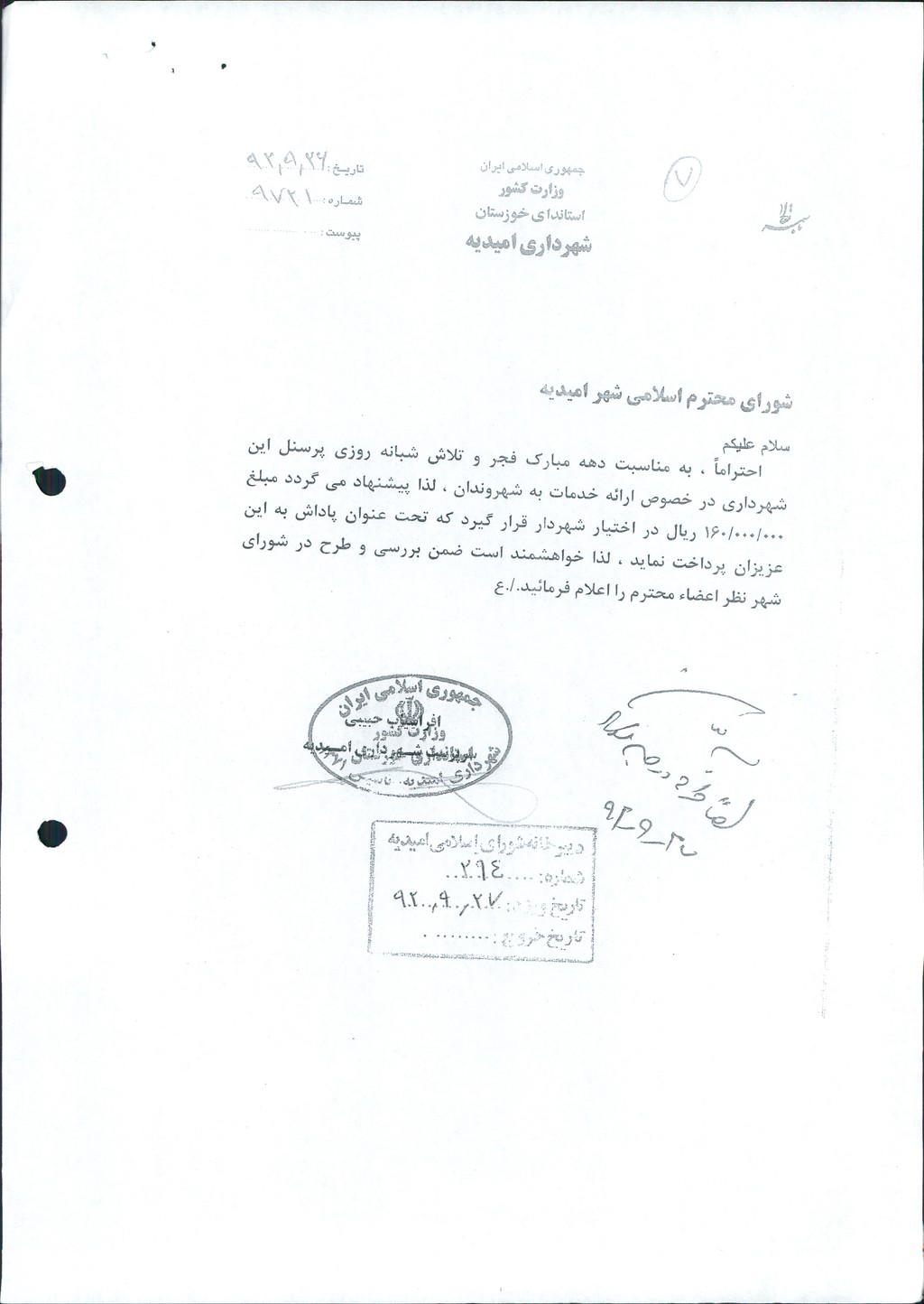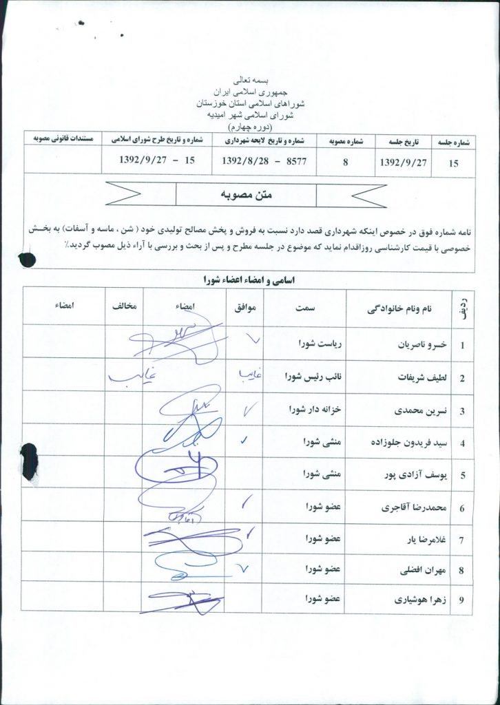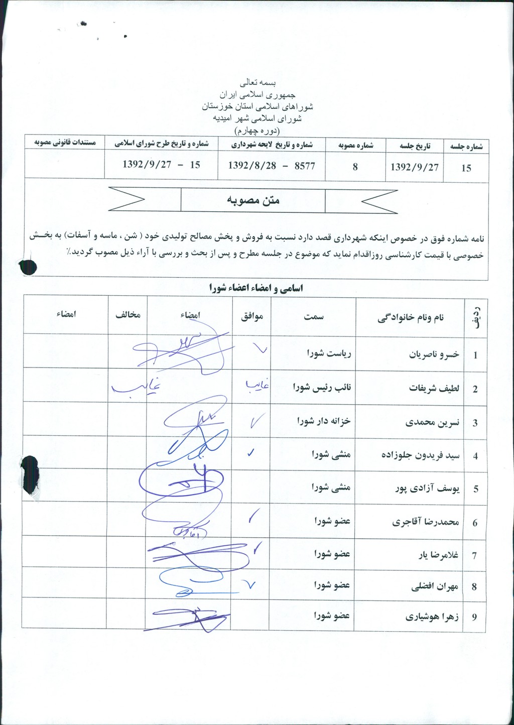 مصوبه شماره ۸ جلسه شماره ۱۵ شورای اسلامی شهر امیدیه