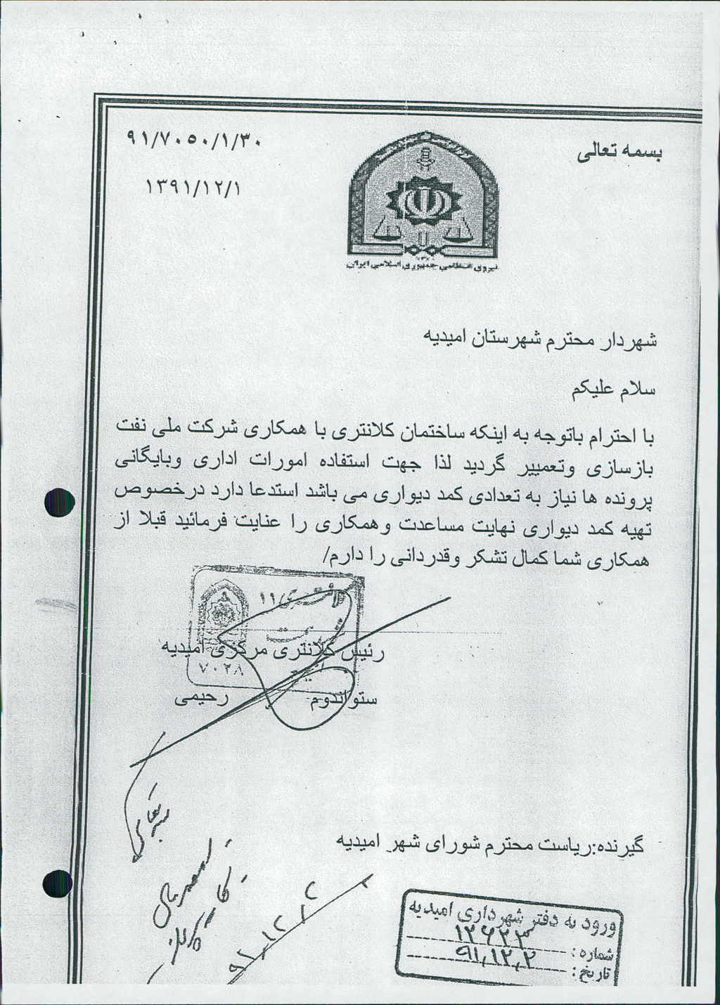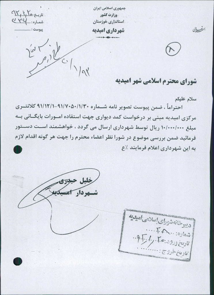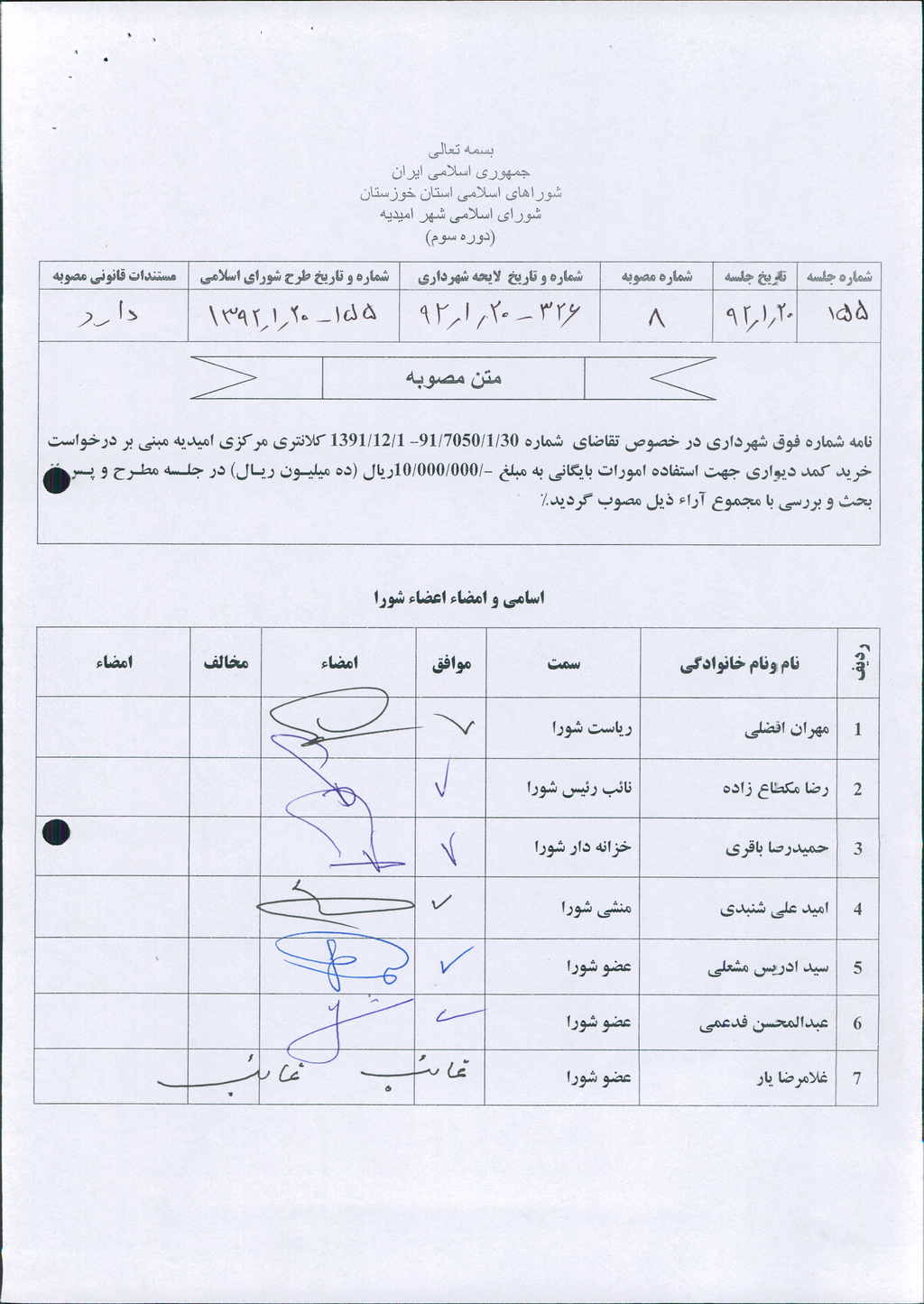 نامه شماره فوق شهرداری در خصوص تقاضای شماره ۳۰/ ۱/ ۷۰۵۰/ ۹۱- ۱/ ۱۲/ ۱۳۹۱ کلانتری مرکزی امیدیه مبنی بر درخواست خرید کمد دیواری جهت استفاده امورات بایگانی به مبلغ -/۰۰۰/۰۰۰/ ۱۰ريال (ده میلیون ريال) در جلسه مطرح و پس از بحث و بررسی با مجموع آراء ذیل مصوب گردید%