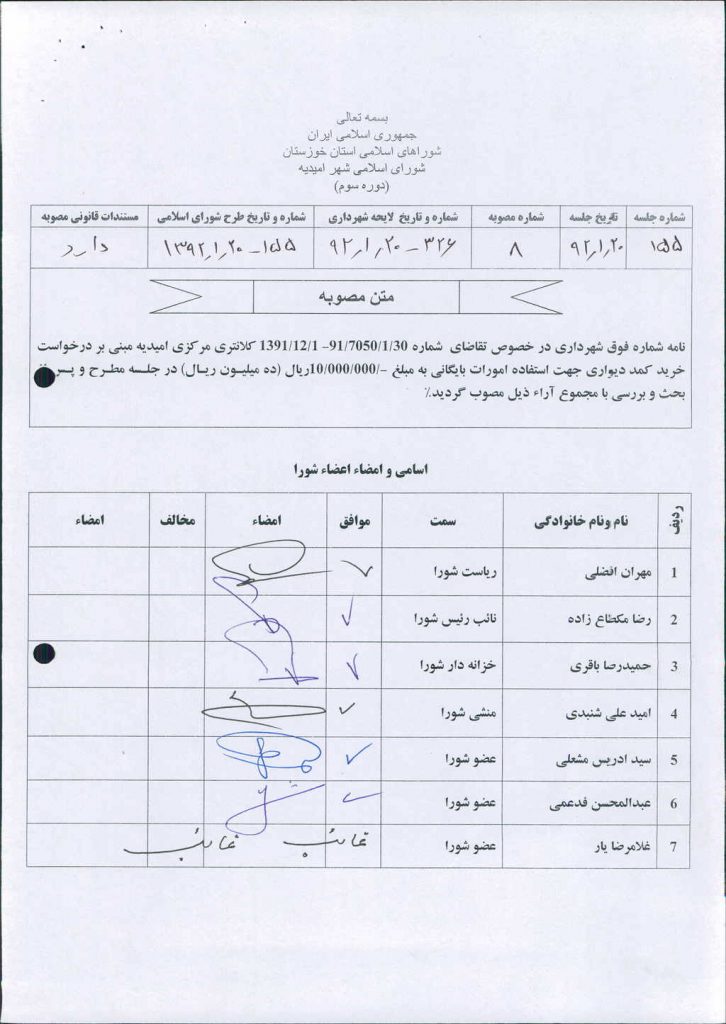 مصوبه شماره ۸ جلسه شماره ۱۵۵ شورای اسلامی شهر امیدیه