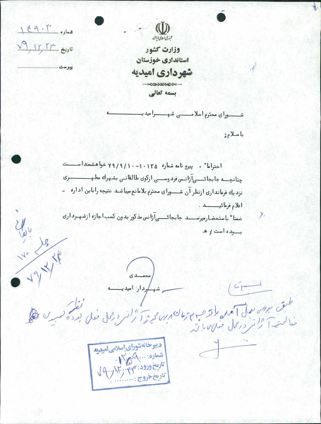 ۸-نامه شماره ۱۴۹۰۳ مورخه ۲۳/ ۱۲/ ۷۹ شهرداري در خصوص جابجائي آژانس تلفني فردوسي از كوي طالقاني به اميديه جنب ميدان شهدا مطرح و با تعداد ۵ رأي موافق به تصويب رسيد.