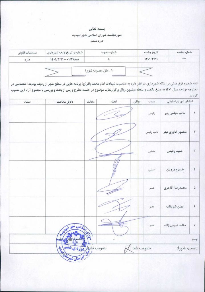 مصوبه شماره ۸ جلسه شماره ۲۳ شورای اسلامی شهر امیدیه