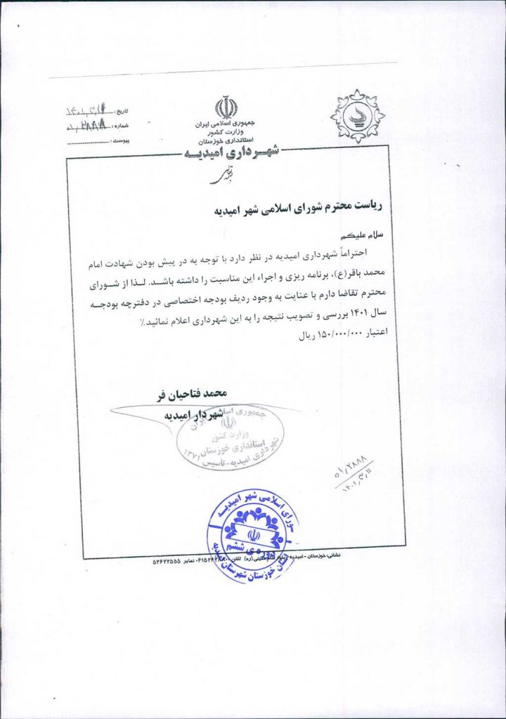 نامه شماره فوق مبنی بر اینکه شهرداری در نظر دارد به مناسبت شهادت امام محمد باقر(ع) برنامه هایی در سطح شهر از ردیف بودجه اختصاصی در دفترچه بودجه سال ۱۴۰۱ به مبلغ یکصد و پنجاه میلیون ریال برگزارنماید موضوع در جلسه مطرح و پس از بحث و بررسی با مجموع آراء ذیل مصوب گردید.