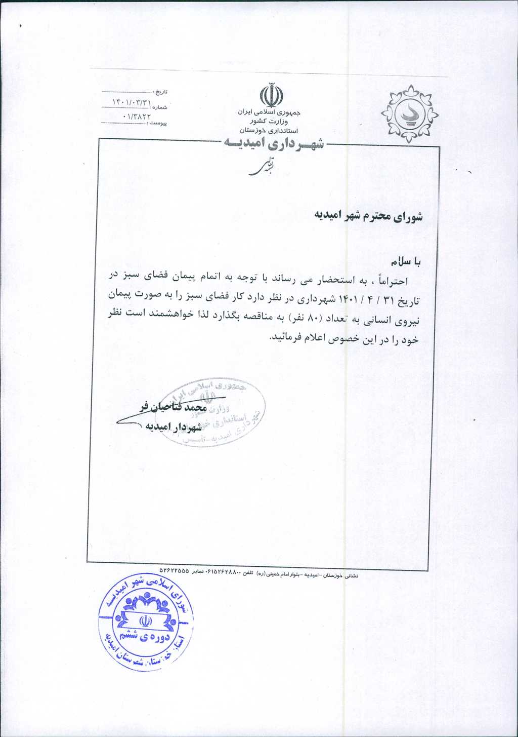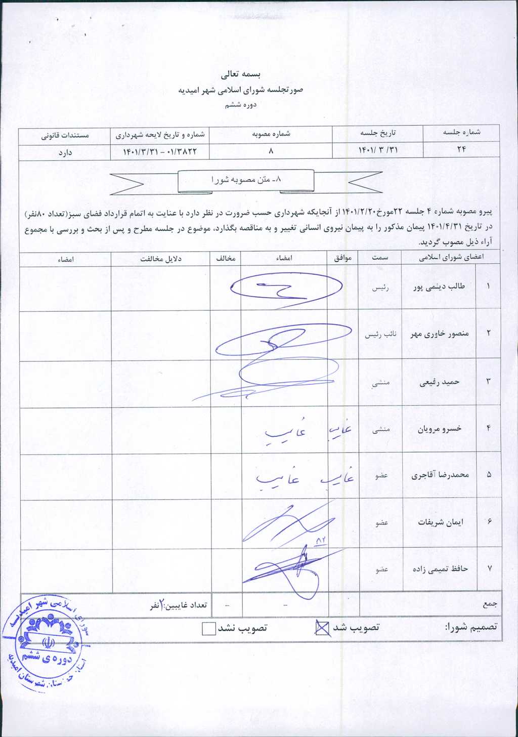 مصوبه شماره ۸ جلسه شماره ۲۴ شورای اسلامی شهر امیدیه