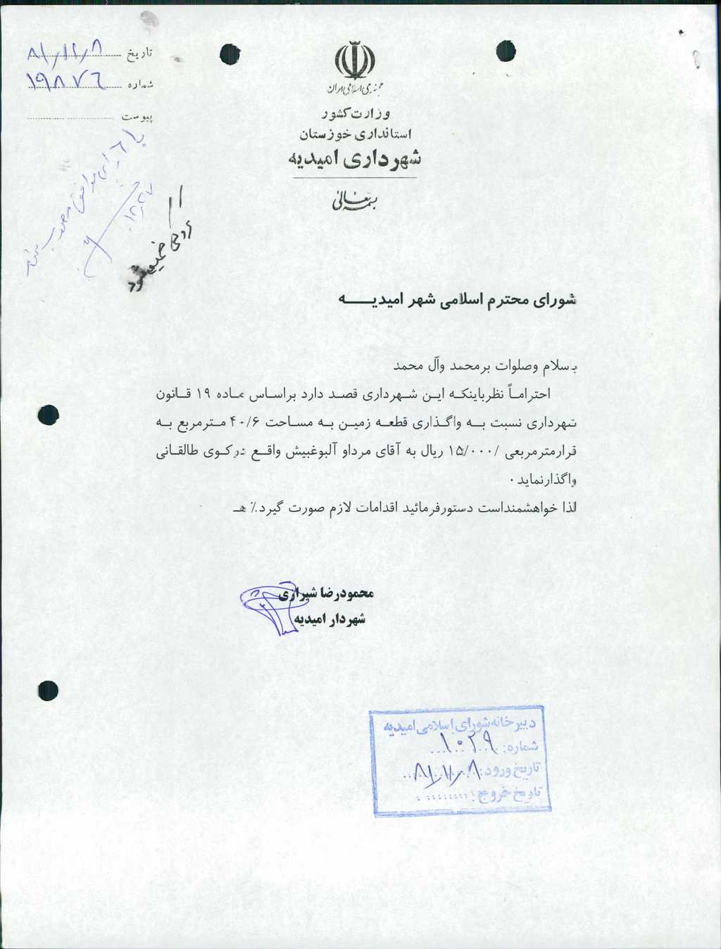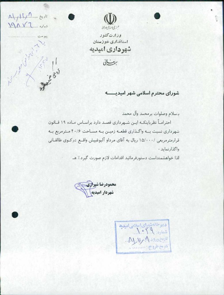 ۸-نامه شماره ۱۹۸۷۶-۷/ ۱۲/ ۸۱ شهرداري مبني بر واگـذاري قطعه زمين به مساحت ۶/ ۴۰مترمربع به قرار متر مربعي ۰۰۰/ ۱۵ريال(پانزده هزار ريال)به آقاي مرداو آلبوغبيش واقع دركوي طالقاني قرائت گرديد كه با ۶ رأي موافق به تصويب رسيد.