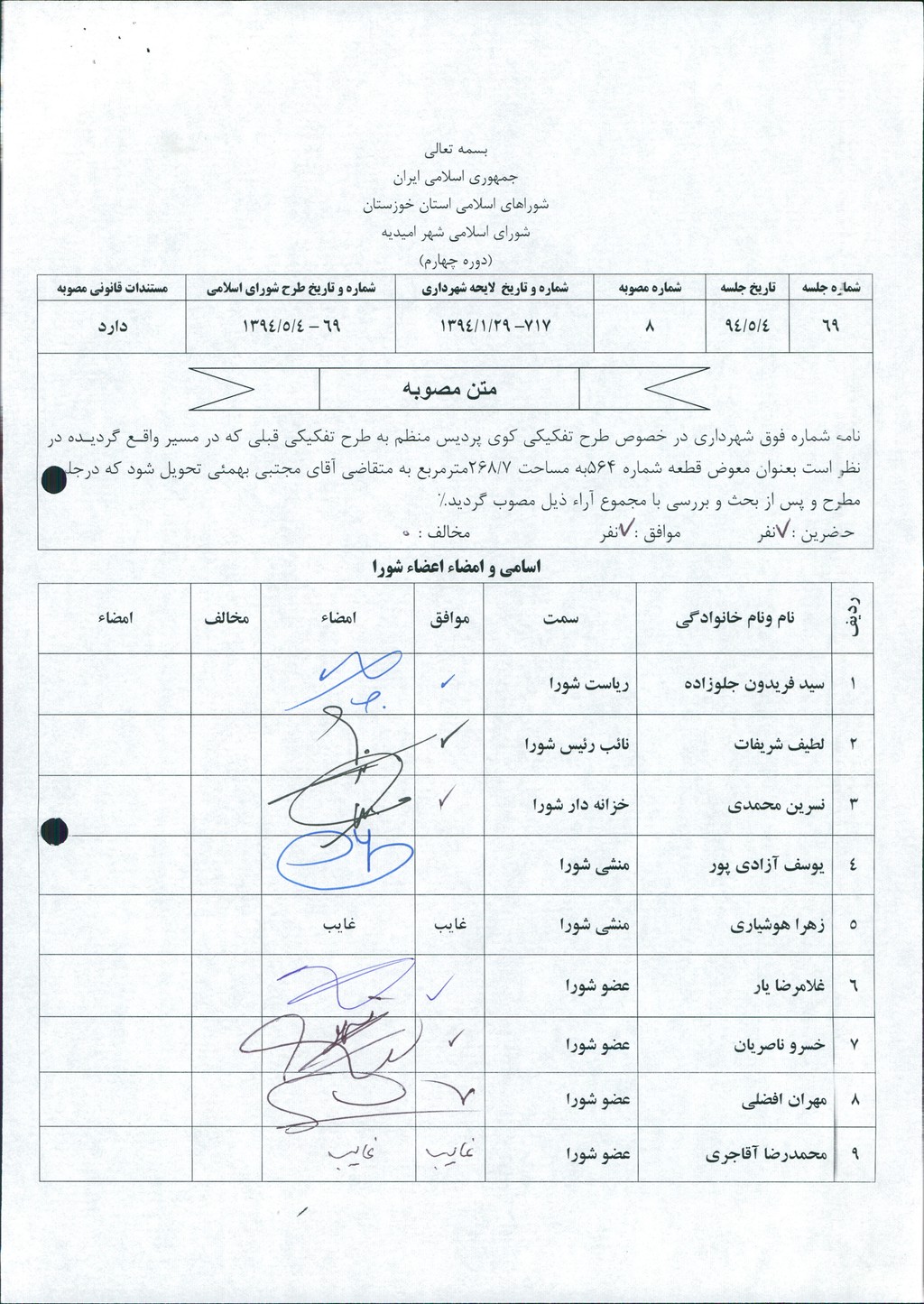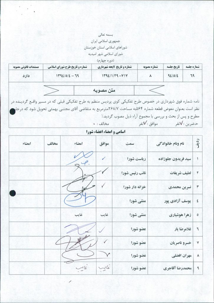 مصوبه شماره ۸ جلسه شماره ۶۹ شورای اسلامی شهر امیدیه