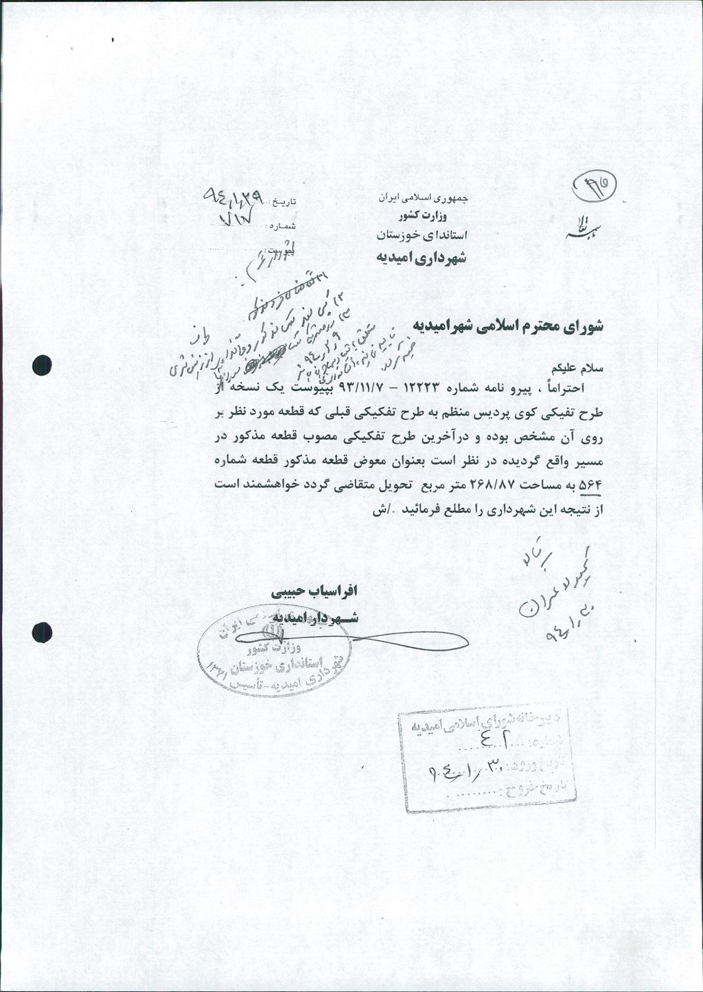 نامه شماره فوق شهرداری در خصوص طرح تفکیکی کوی پردیس منظم به طرح تفکیکی قبلی که در مسیر واقع گردیده در نظر است بعنوان معوض قطعه شماره ۵۶۴به مساحت ۷/۲۶۸مترمربع به متقاضی آقای مجتبی بهمئی تحویل شود که درجلسه مطرح و پس از بحث و بررسی با مجموع آراء ذیل مصوب گردید%
