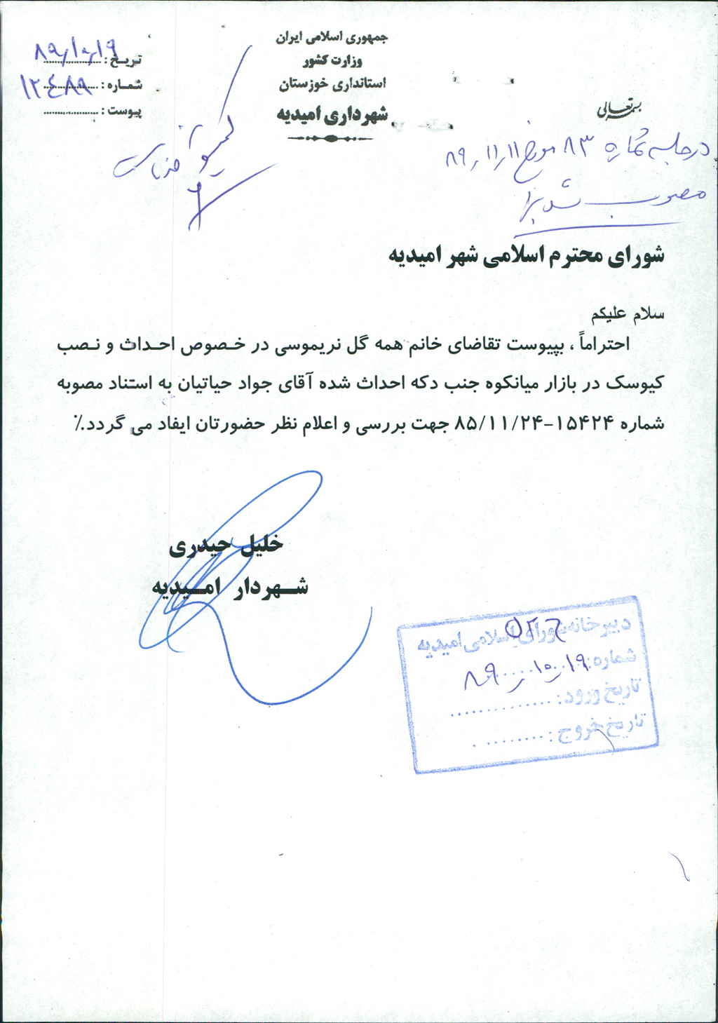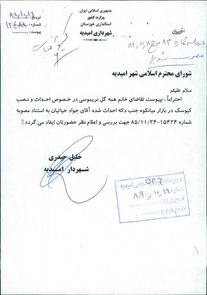 نامه شماره فوق شهرداری مبنی بر درخواست خانم همه گل نریموسی در خصوص احداث و نصب کیوسک در بازار میانکوه جنب دکه احداثی آقای جواد حیاتیان بود که پس از بحث و بررسی با مجموع آراء ذیل مصوب گردید%