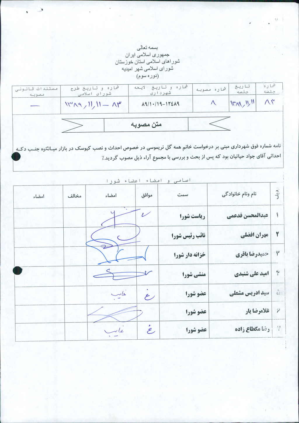 مصوبه شماره ۸ جلسه شماره ۸۳ شورای اسلامی شهر امیدیه