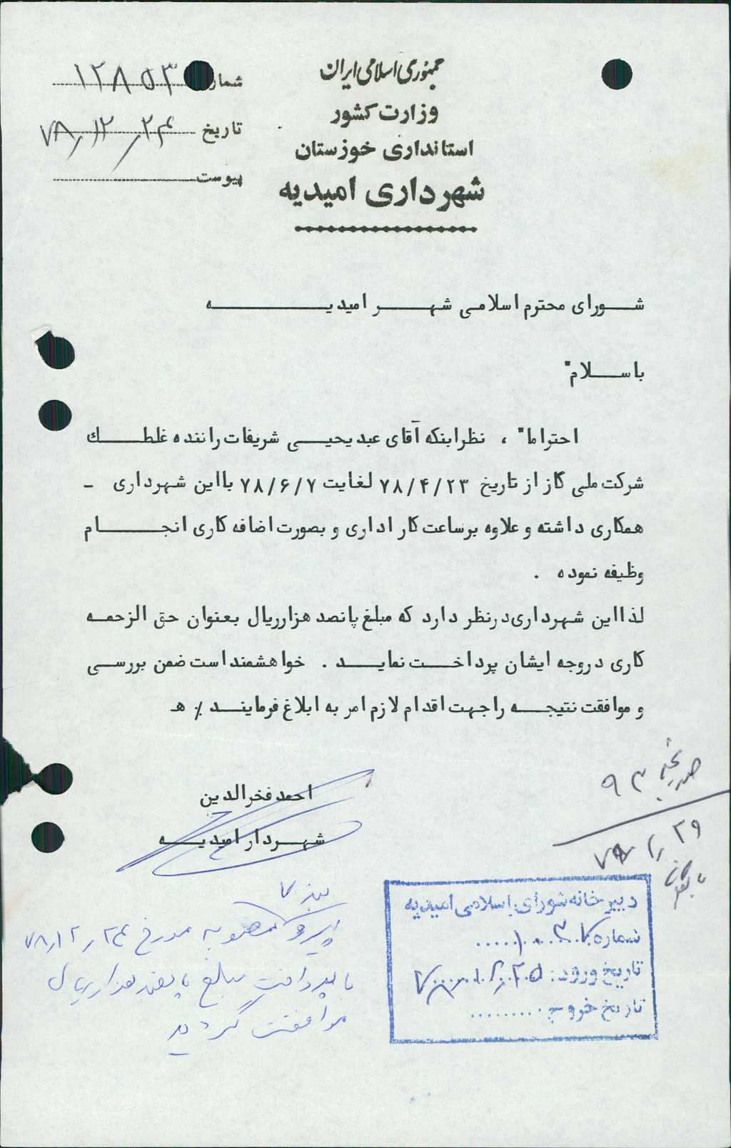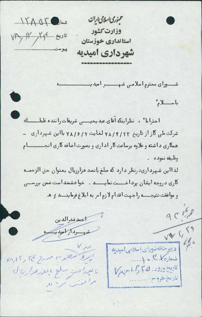 ۸-نامه شماره ۱۲۸۵۳مورخ ۲۴/ ۱۲/ ۷۸در خصوص كاركرد آقاي عبد يحيي شريفات راننده غلطك شركت ملي گاز كه از تاريخ ۲۳/ ۴/ ۷۸لغايت ۷/ ۶/ ۷۸با شهرداري همكاري داشته پيرو بند ۷ مصوبه مورخه ۲۴/ ۱۲/ ۷۸با پرداخت مبلغ -/۰۰۰/ ۵۰۰ريال به نامبرده با تعداد۶رأي ممتنع مصوب گرديد.