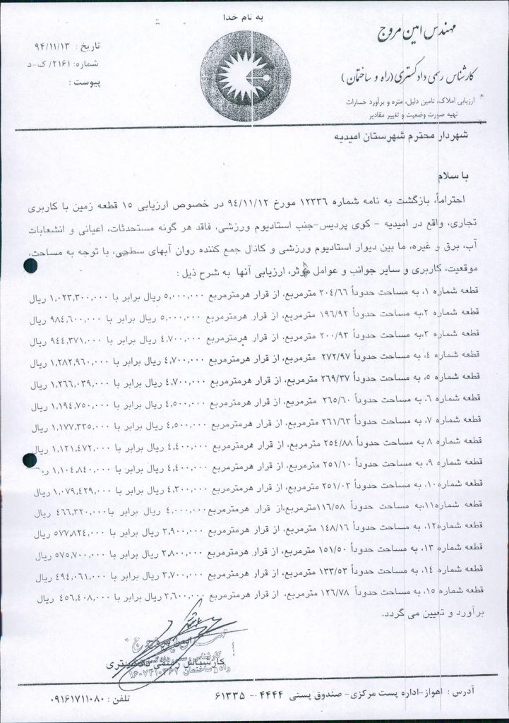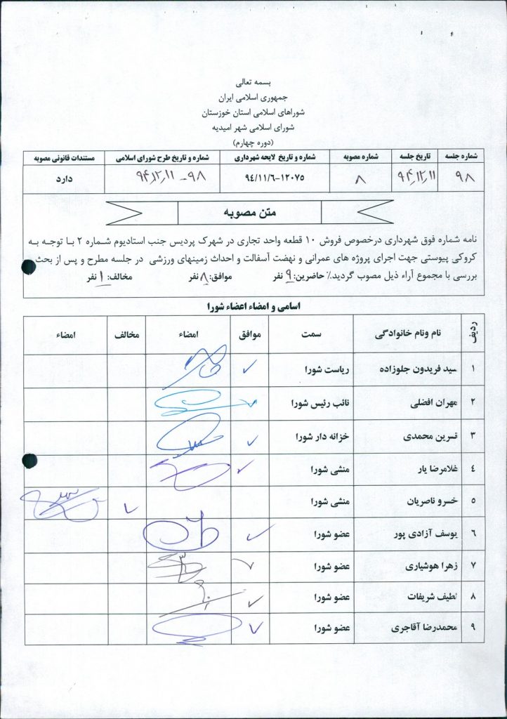 مصوبه شماره ۸ جلسه شماره ۹۸ شورای اسلامی شهر امیدیه