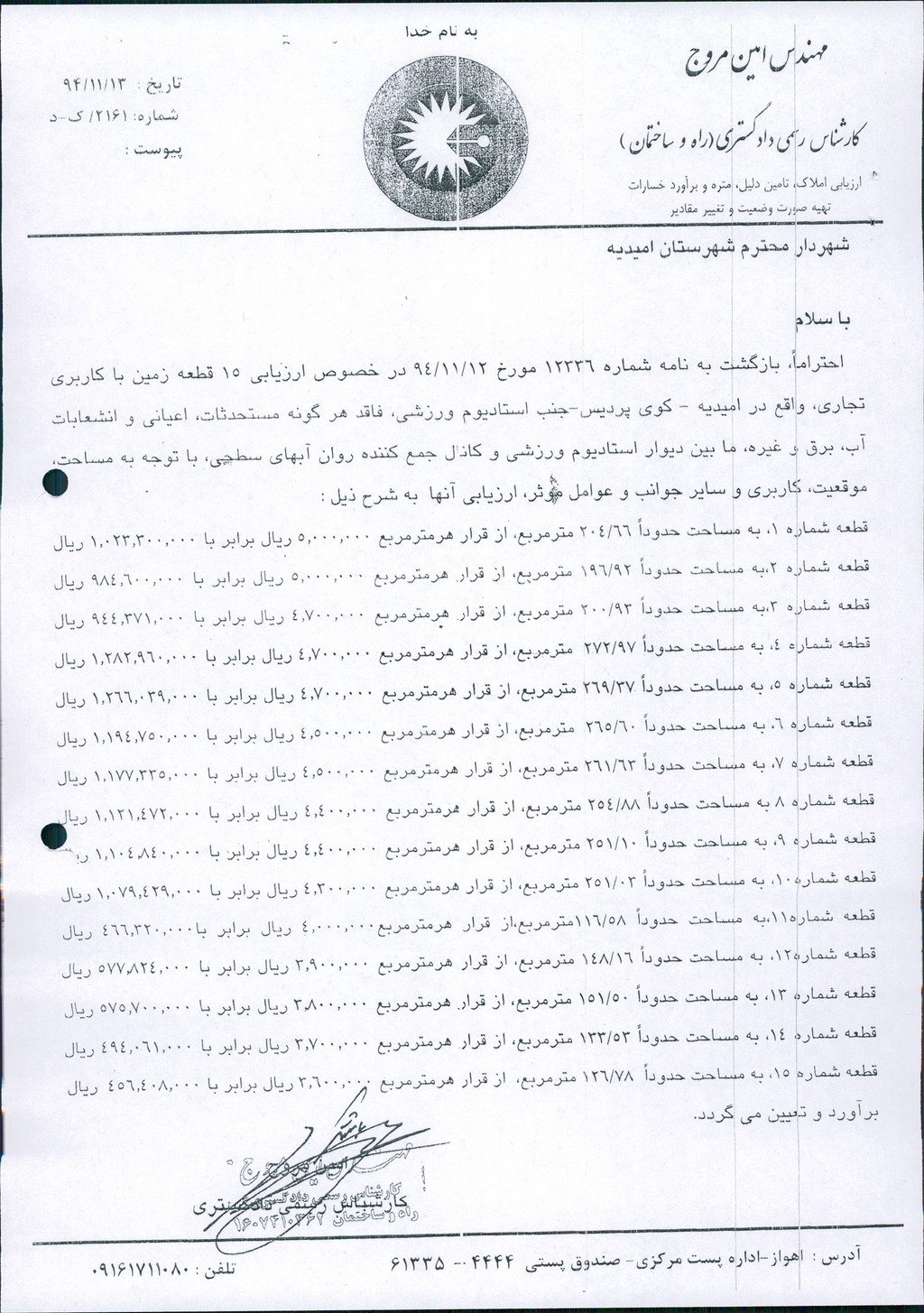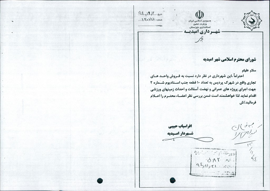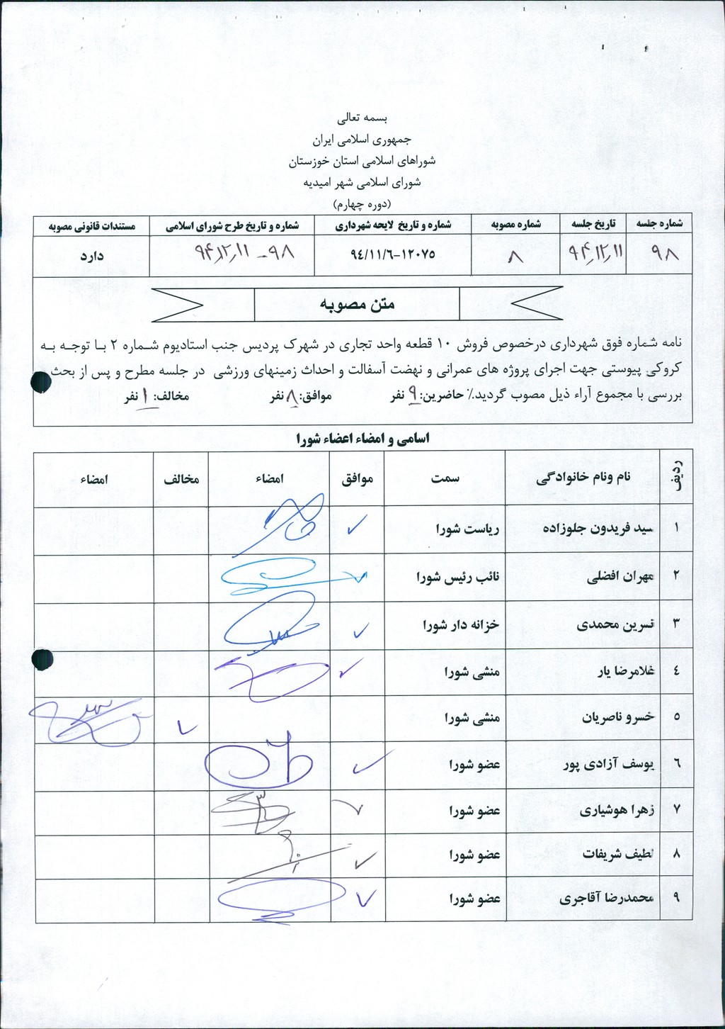 مصوبه شماره ۸ جلسه شماره ۹۸ مورخ ۹۴/۱۲/۱۱ شورای اسلامی شهر امیدیه