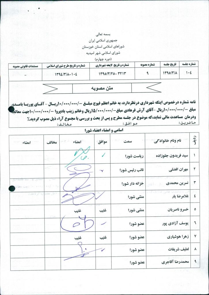مصوبه شماره ۹ جلسه شماره ۱۰۴ شورای اسلامی شهر امیدیه