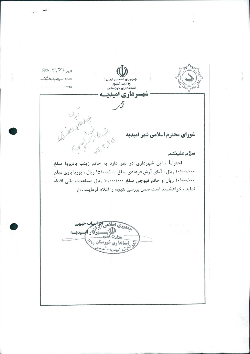 نامه شماره درخصوص اینکه شهرداری درنظردارد، به خانم اعظم فیوج مبلغ ۱۰۰۰۰۰۰۰ريال – آقای پوریا بامدی مبلغ ۱۰۰۰۰۰۰۰ريال –آقای آرش فرهادی مبلغ ۱۵۰۰۰۰۰۰ريال وخانم زینب بادپروا ۱۰۰۰۰۰۰۰ جهت معالجه ودرمان مساعدت مالی نماید،که موضوع در جلسه مطرح و پس از بحث و بررسی با مجموع آراء ذیل مصوب گردید%