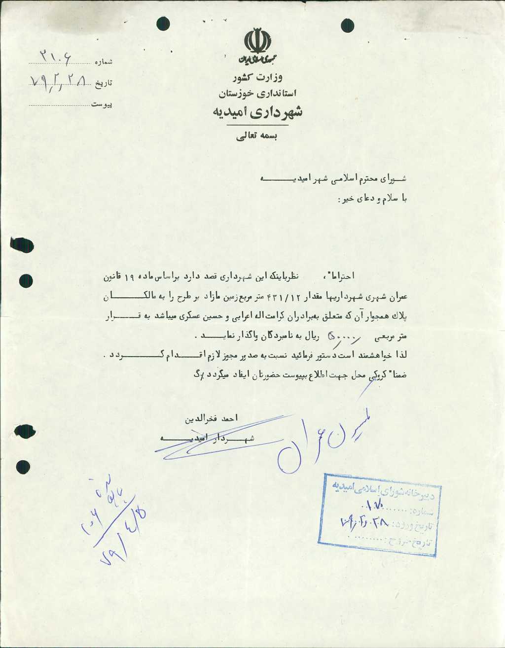 ۹-نامه شماره ۲۱۰۶مورخ ۲۸/ ۲/ ۷۹شهرداري در خصوص واگذاري مقدار ۱۲/ ۴۳۱متر مربع زمين مازاد بر طرح به مالكان پلاك همجوار آن متعلق به برادران كرامت الله اعرابي و حسن عسكري به قرار هر متر مربع -/۰۰۰/ ۵۰ ريال مطرح و با ۶ رأي موافق به تصويب رسيد.