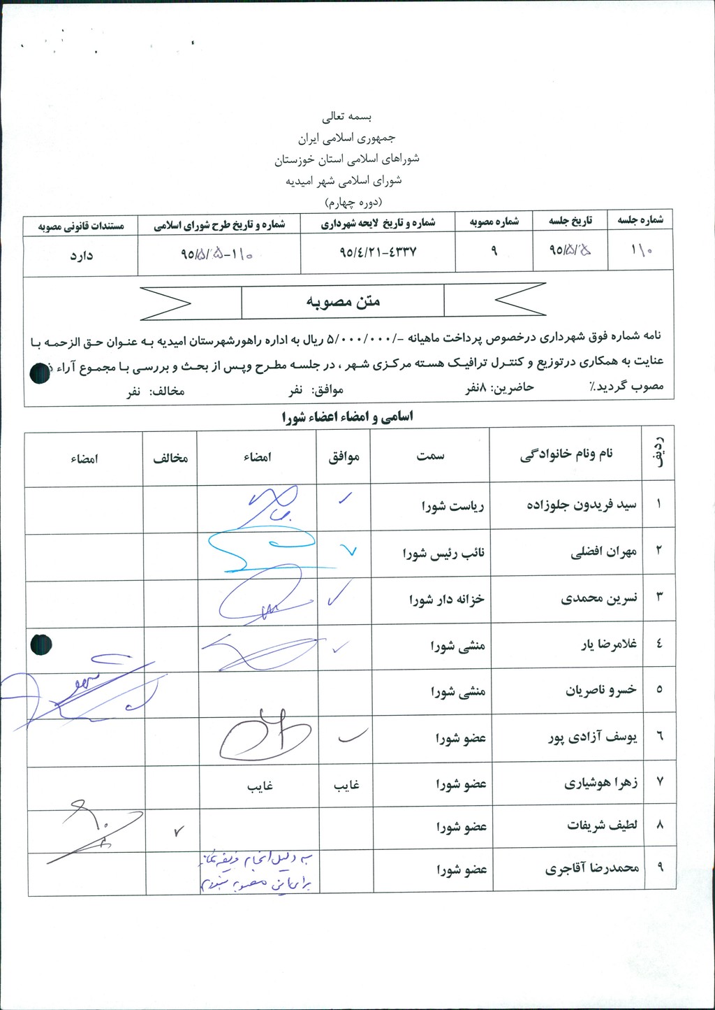 مصوبه شماره ۹ جلسه شماره ۱۱۰ شورای اسلامی شهر امیدیه