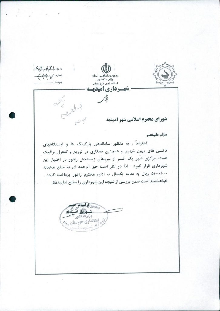 نامه شماره فوق شهرداری در خصوص پرداخت ماهیانه ۵۰۰۰۰۰۰ ریال به اداره راهور شهرستان امیدیه به عنوان حق الزحمه با عنایت به همکاری در توزیع و کنترل ترافیک هسته مرکزی شهر ، در جلسه مطرح و پس از بحث و بررسی با مجموع آراء ذیل مصوب گردید%