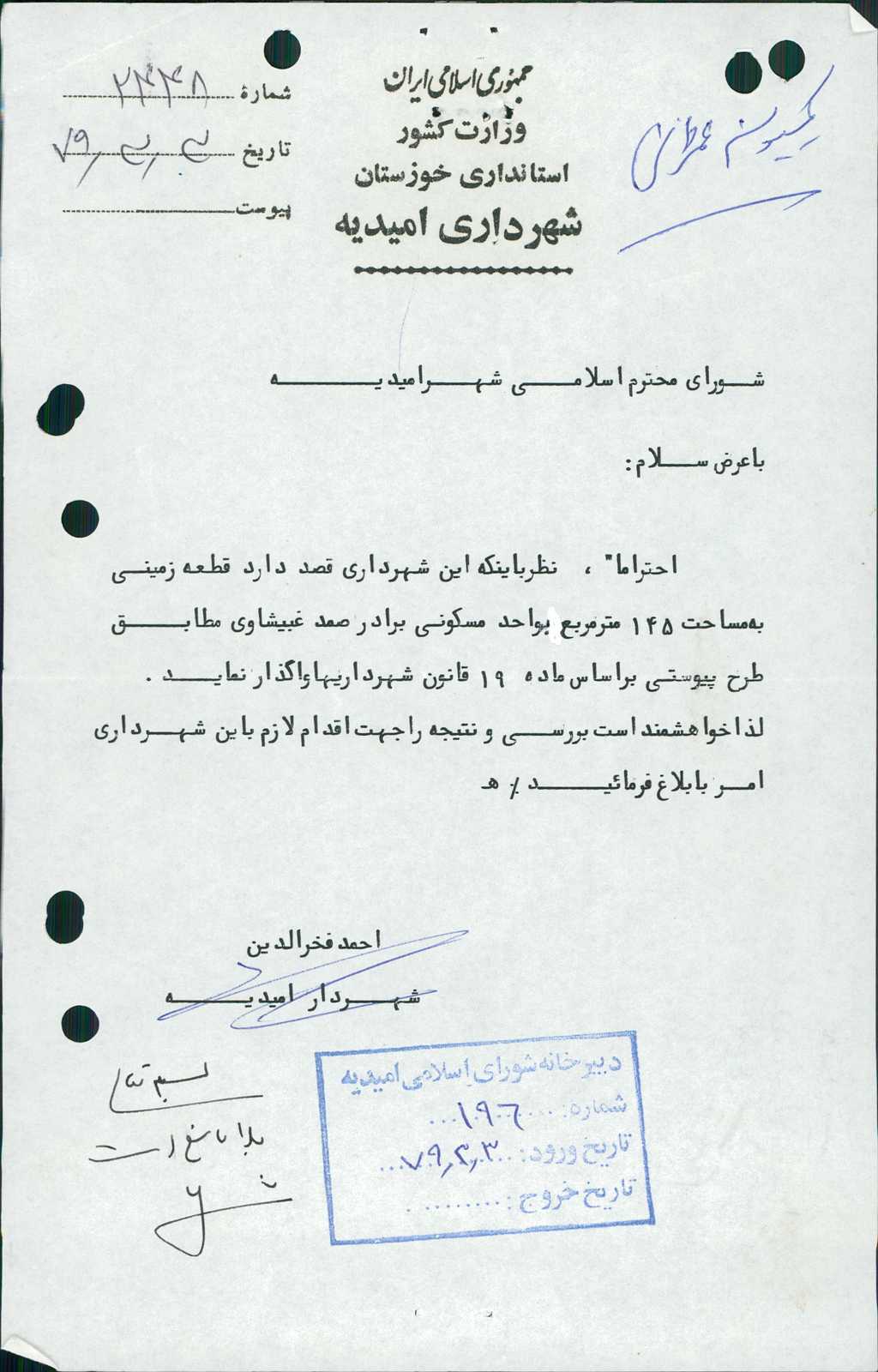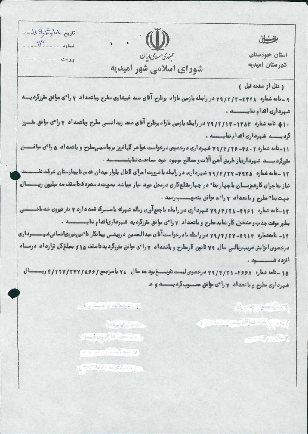 مصوبه شماره ۹ جلسه شماره ۱۱۶ مورخ ۷۹/۴/۲۸ شورای اسلامی شهر امیدیه