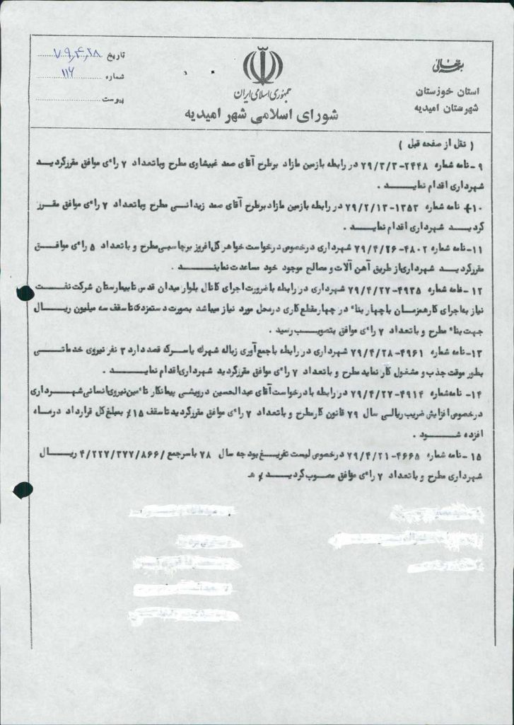 مصوبه شماره ۹ جلسه شماره ۱۱۶ شورای اسلامی شهر امیدیه