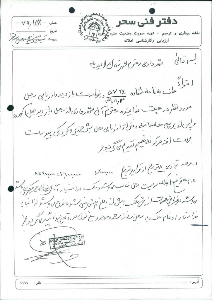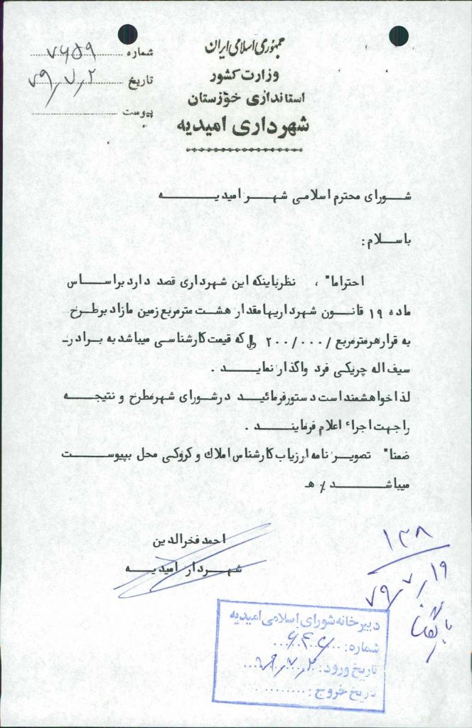 مصوبه شماره ۹ جلسه شماره ۱۳۸ مورخ ۷۹/۷/۱۹ شورای اسلامی شهر امیدیه
