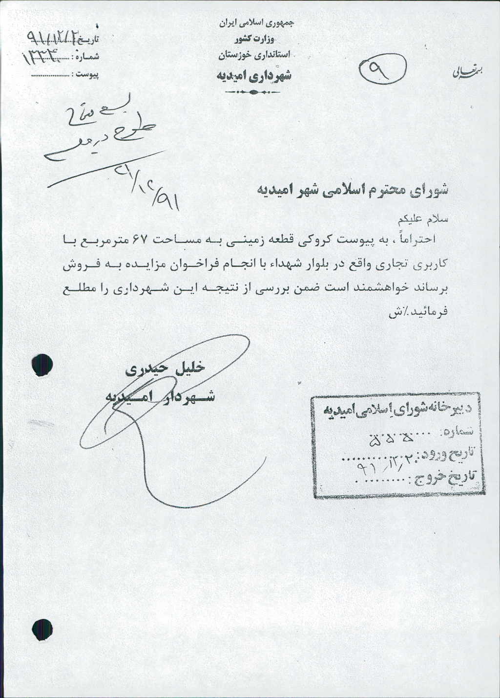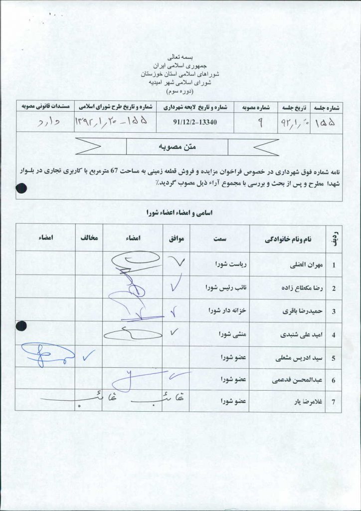 مصوبه شماره ۹ جلسه شماره ۱۵۵ مورخ ۹۲/۱/۲۰ شورای اسلامی شهر امیدیه
