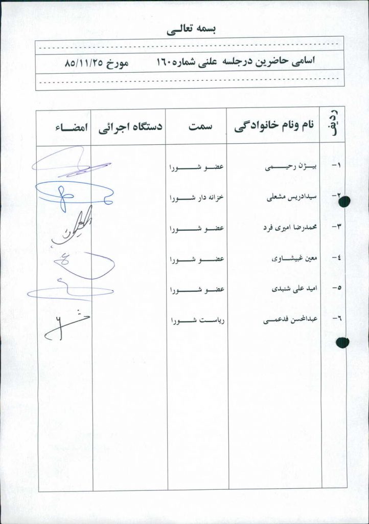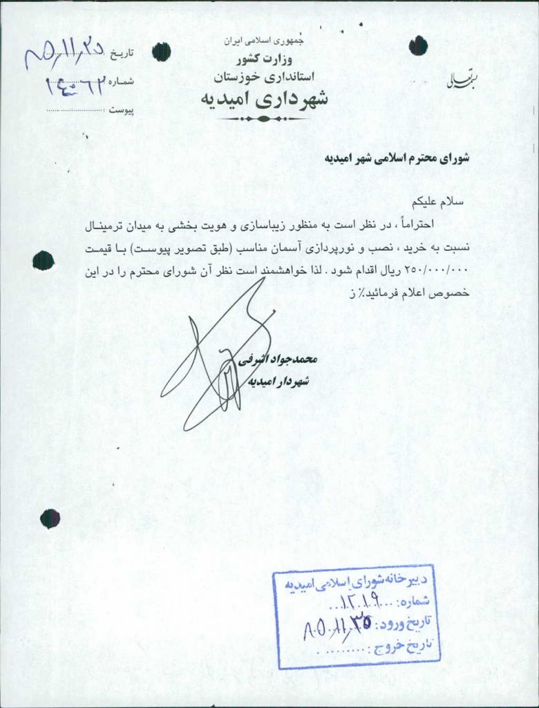 مصوبه شماره ۹ جلسه شماره ۱۶۰ مورخ ۸۵/۱۱/۲۵ شورای اسلامی شهر امیدیه