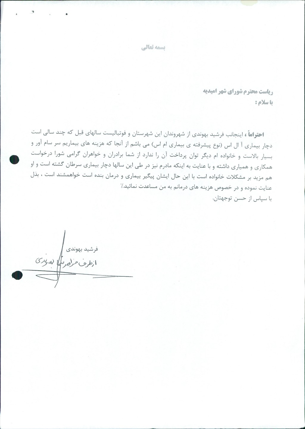 در خصوص تخصیص مبلغ ۱۵۰۰۰۰۰۰ ريال جهت مساعدت به بیمار فرشید بهوندی (از جوانان فوتبالیست و با اخلاق شهرستان که به نوعی بیماری ناشناخته دچارگردیده وباعث فلج کامل ایشان شده است) در جلسه مطرح و با آراء ذیل مصوب گردید%