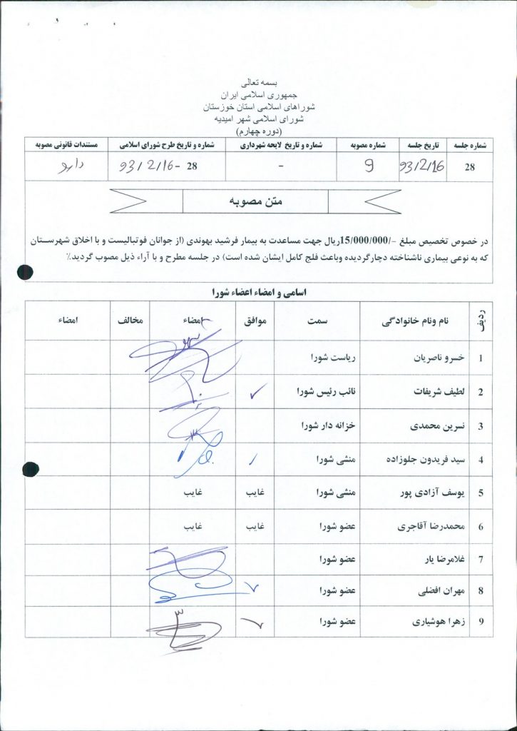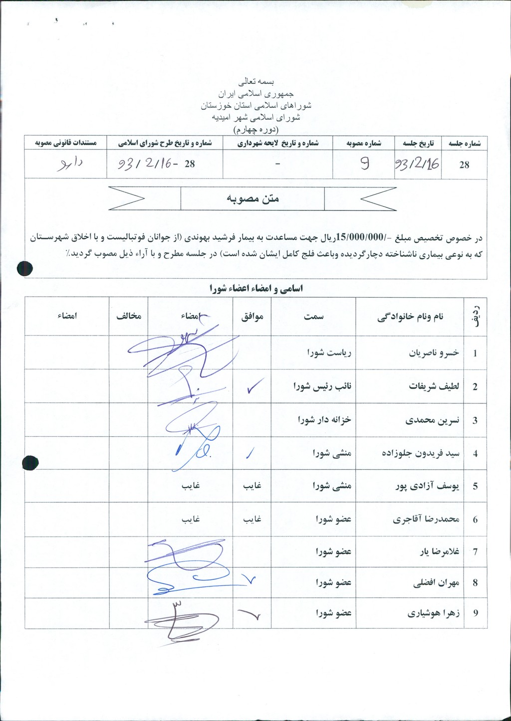 مصوبه شماره ۹ جلسه شماره ۲۸ شورای اسلامی شهر امیدیه