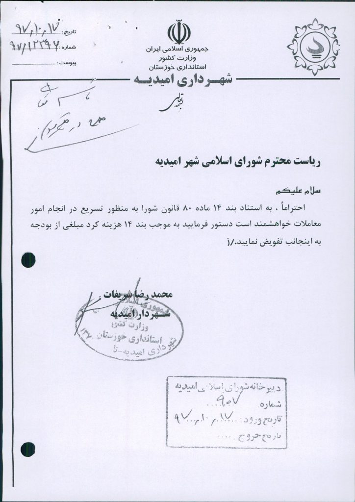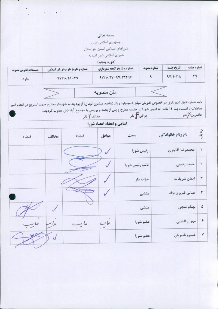 مصوبه شماره ۹ جلسه شماره ۴۹ شورای اسلامی شهر امیدیه