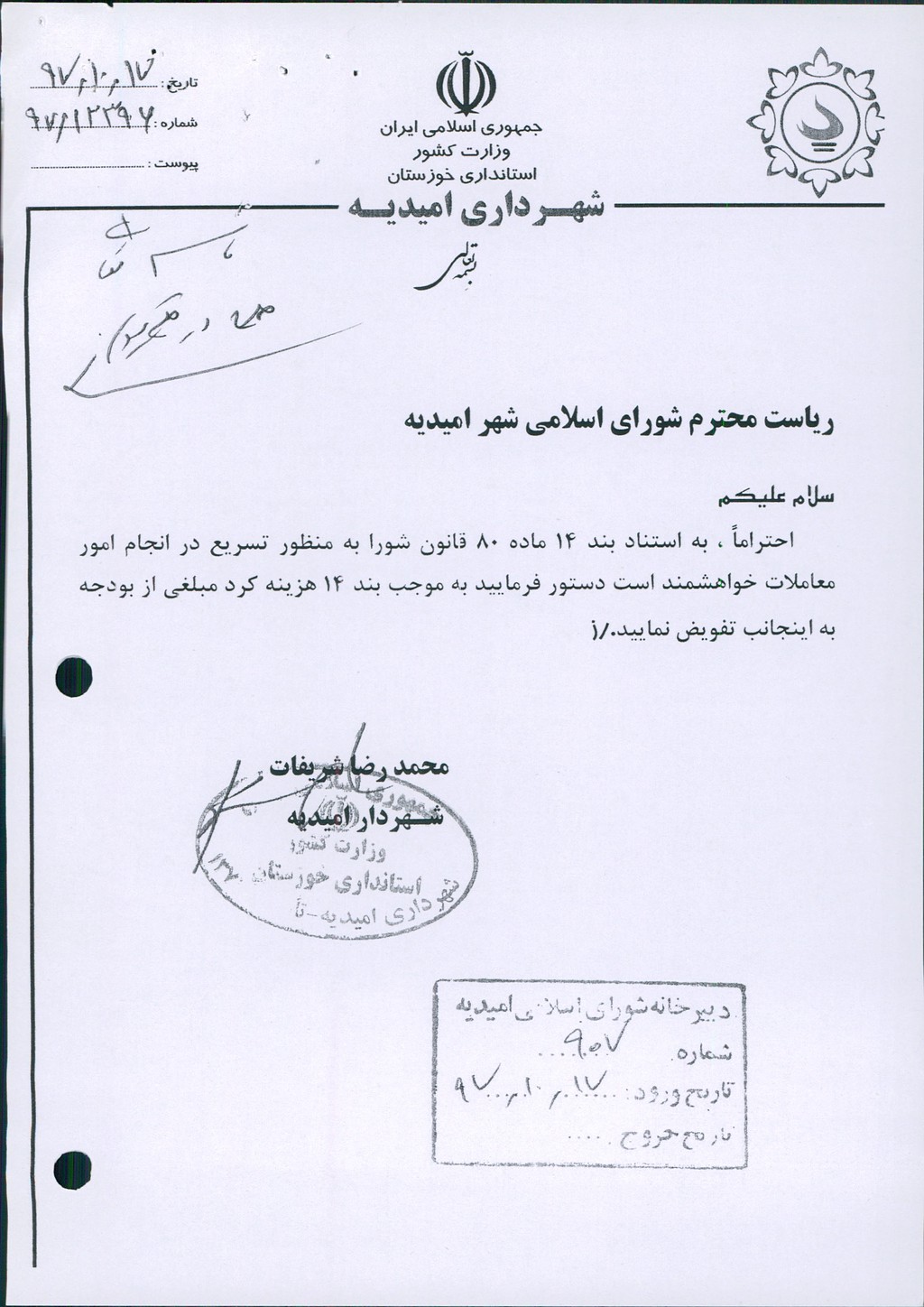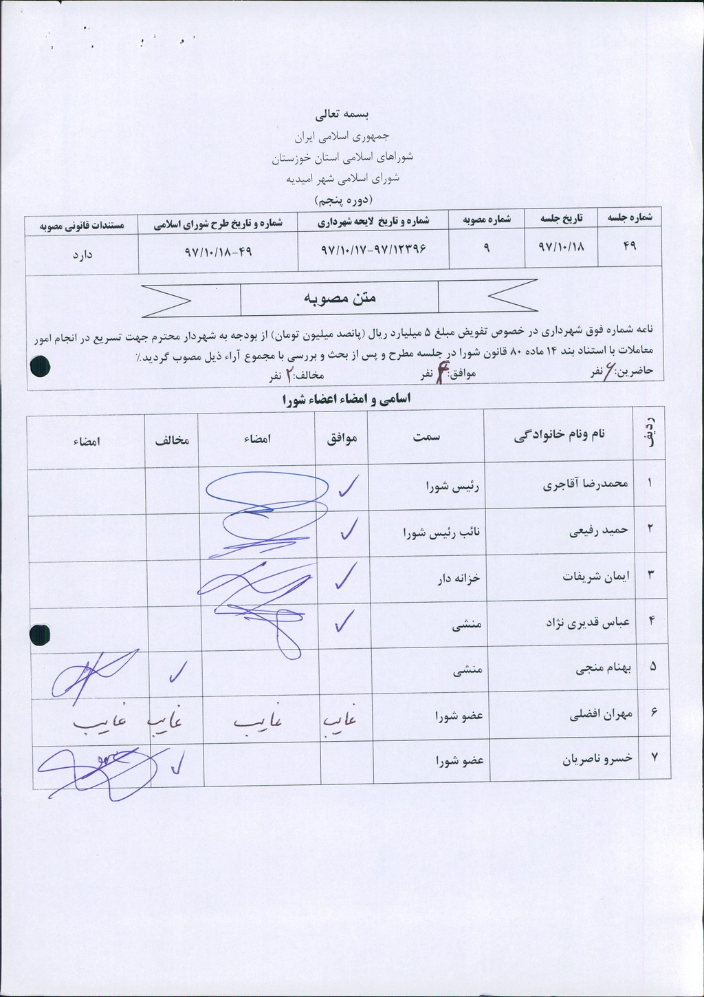 مصوبه شماره ۹ جلسه شماره ۴۹ مورخ ۹۷/۱۰/۱۸ شورای اسلامی شهر امیدیه