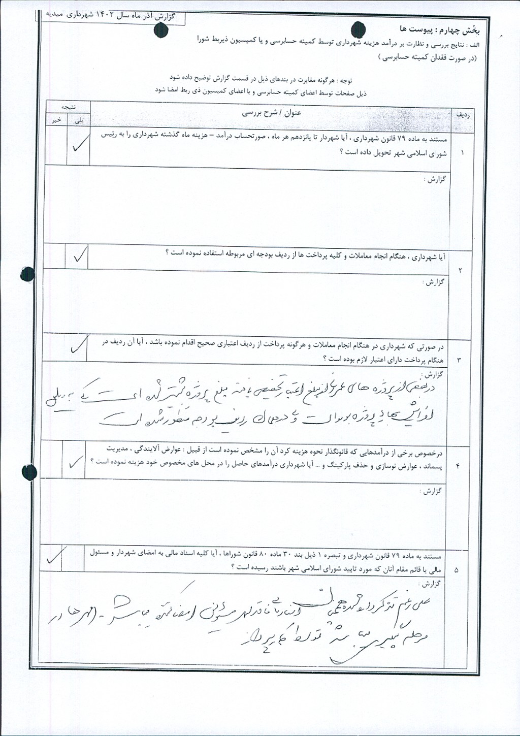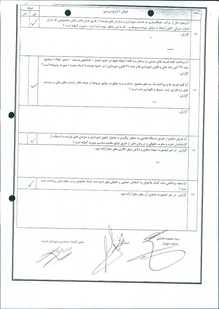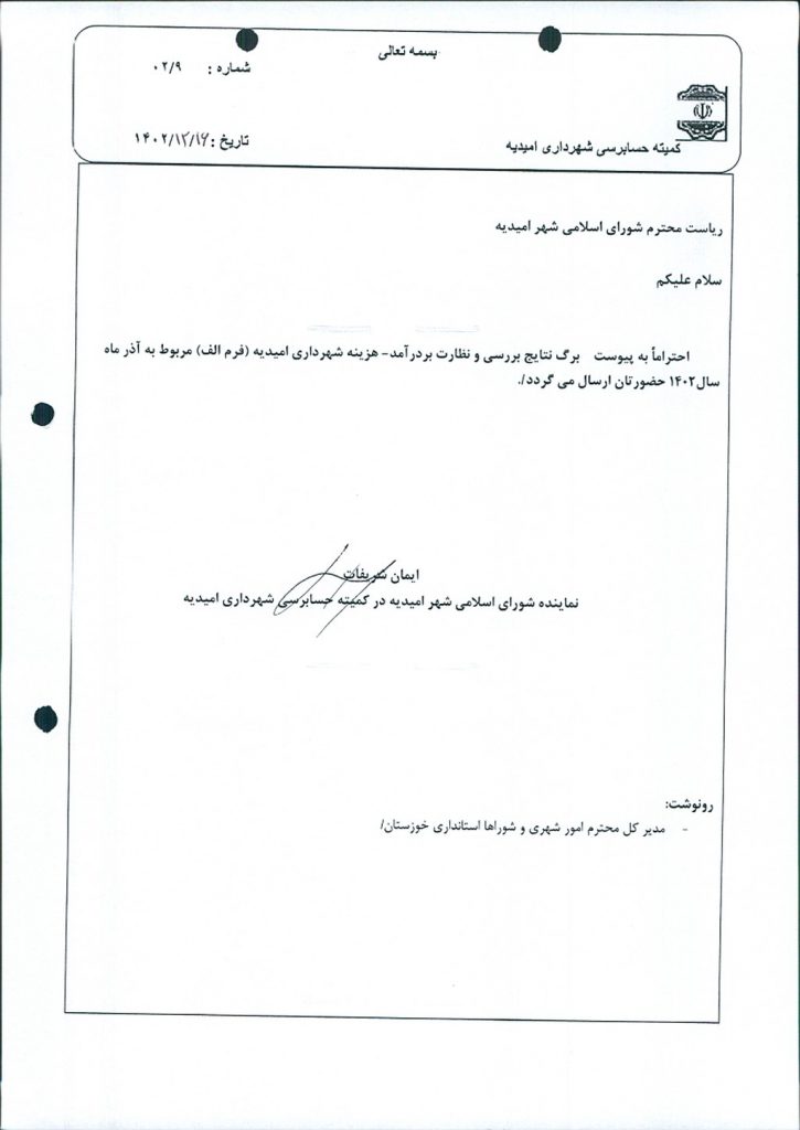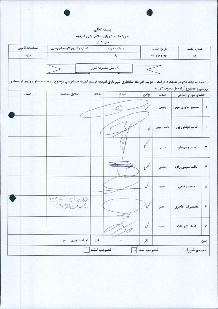 با توجه به ارائه گزارش عملکرد درآمد – هزینه آذر ماه سالجاری شهرداری امیدیه توسط کمیته حسابرسی موضوع در جلسه مطرح و پس از بحث و بررسی با مجموع آراء ذیل مصوب گردید.