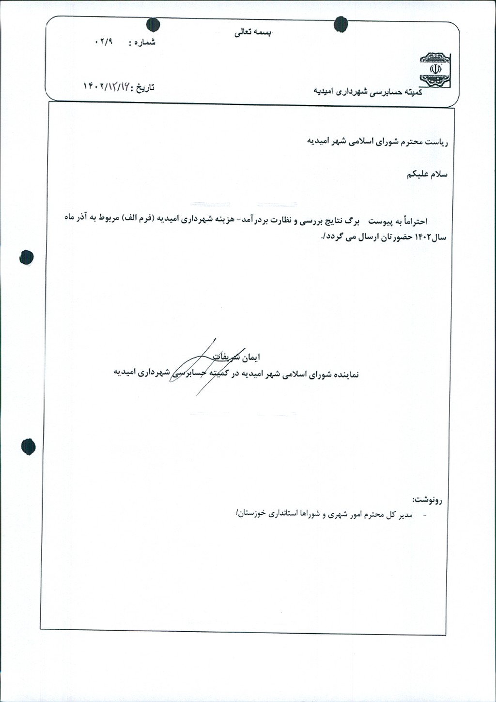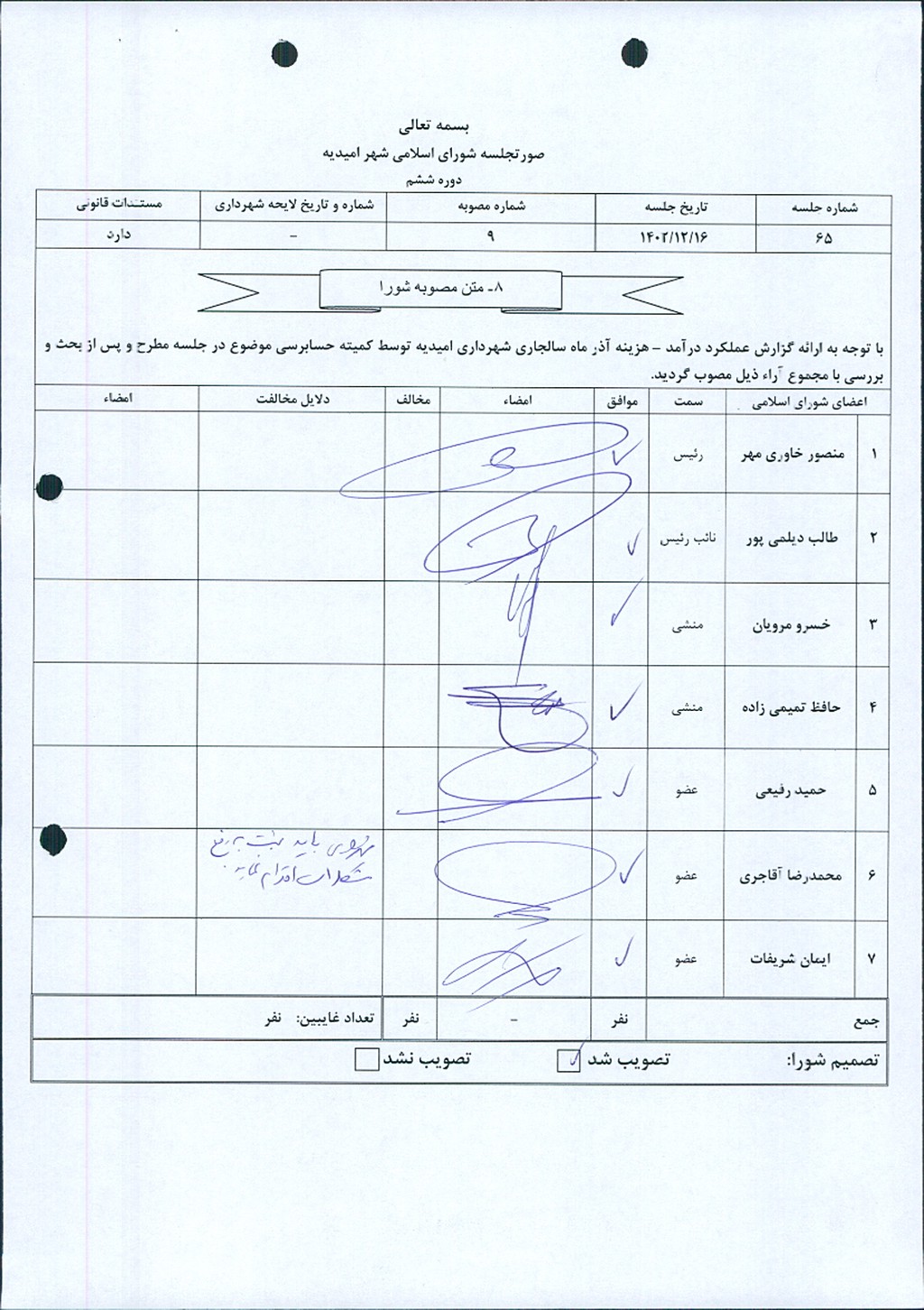 مصوبه شماره ۹ جلسه شماره ۶۵ مورخ ۱۴۰۲/۱۲/۱۶ شورای اسلامی شهر امیدیه