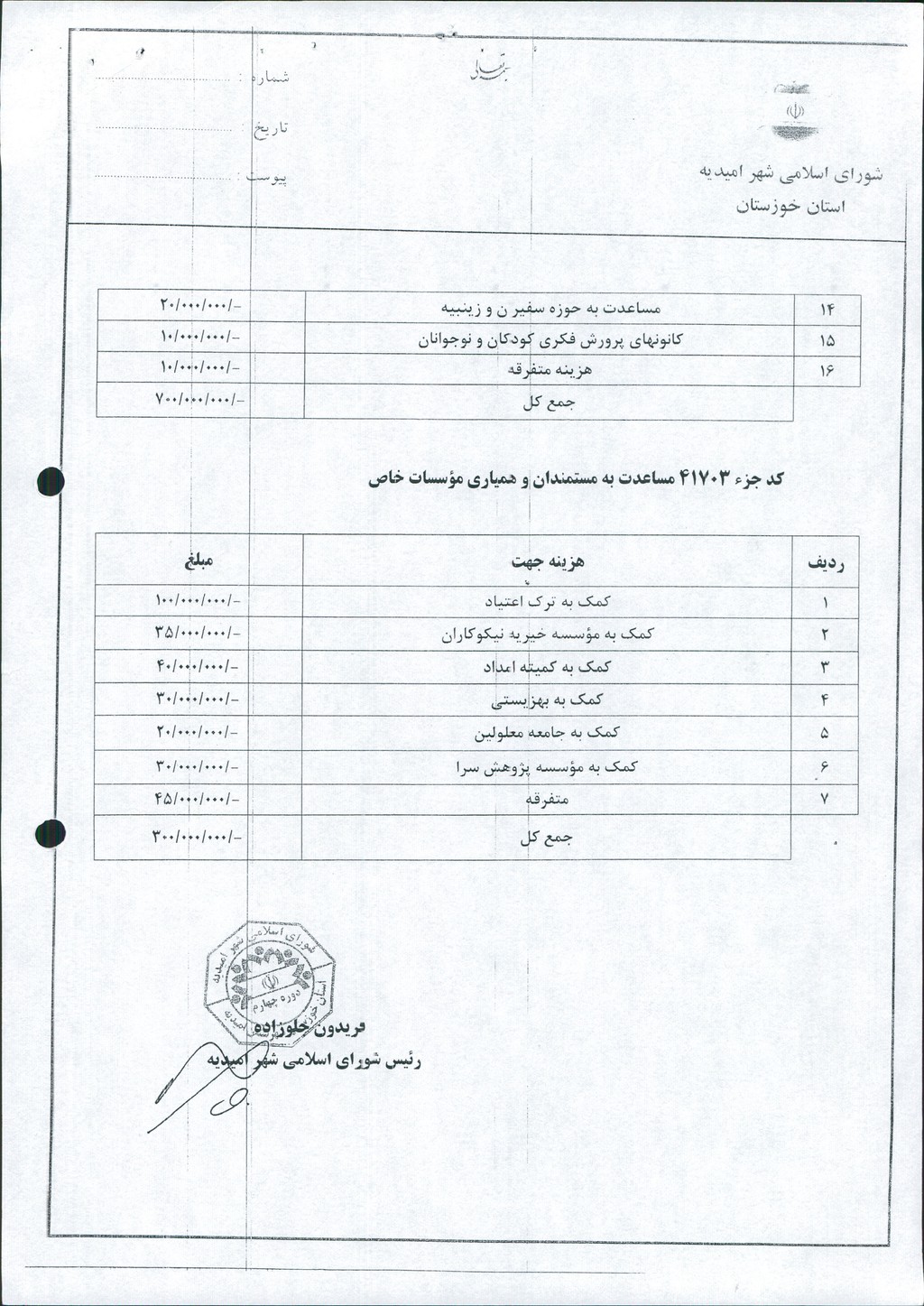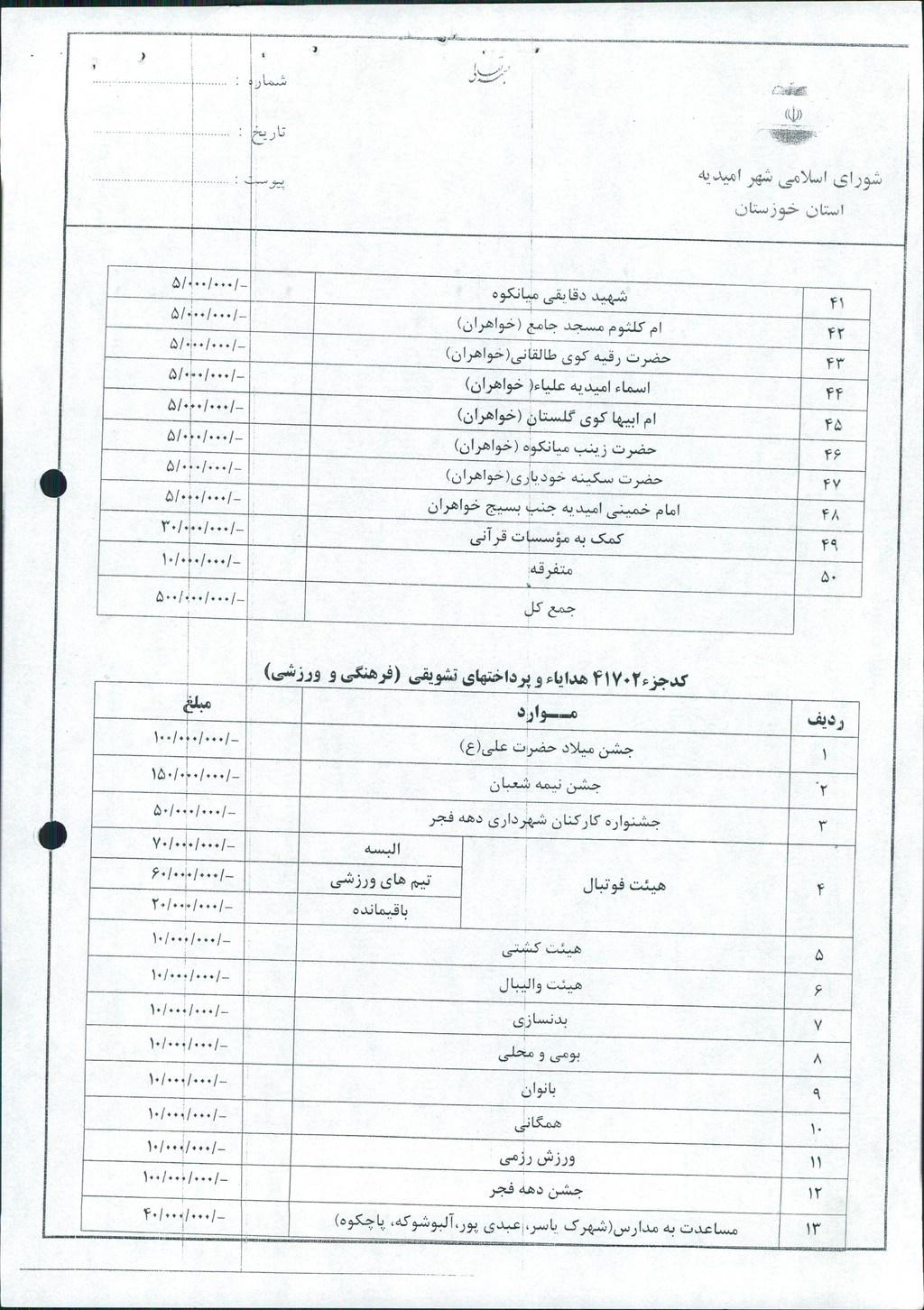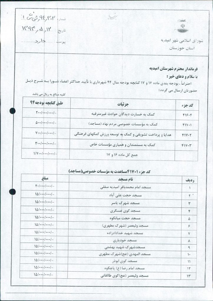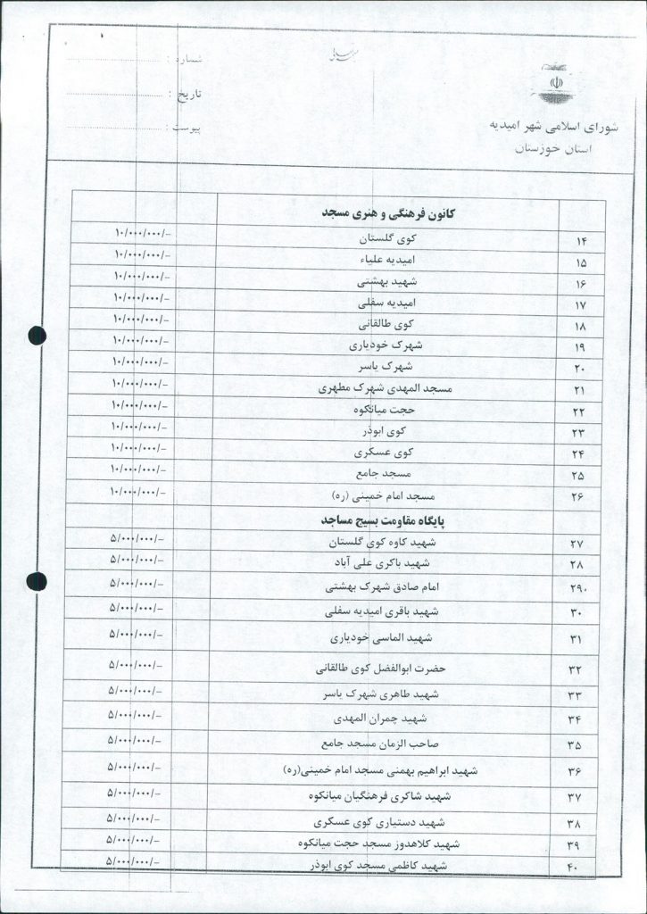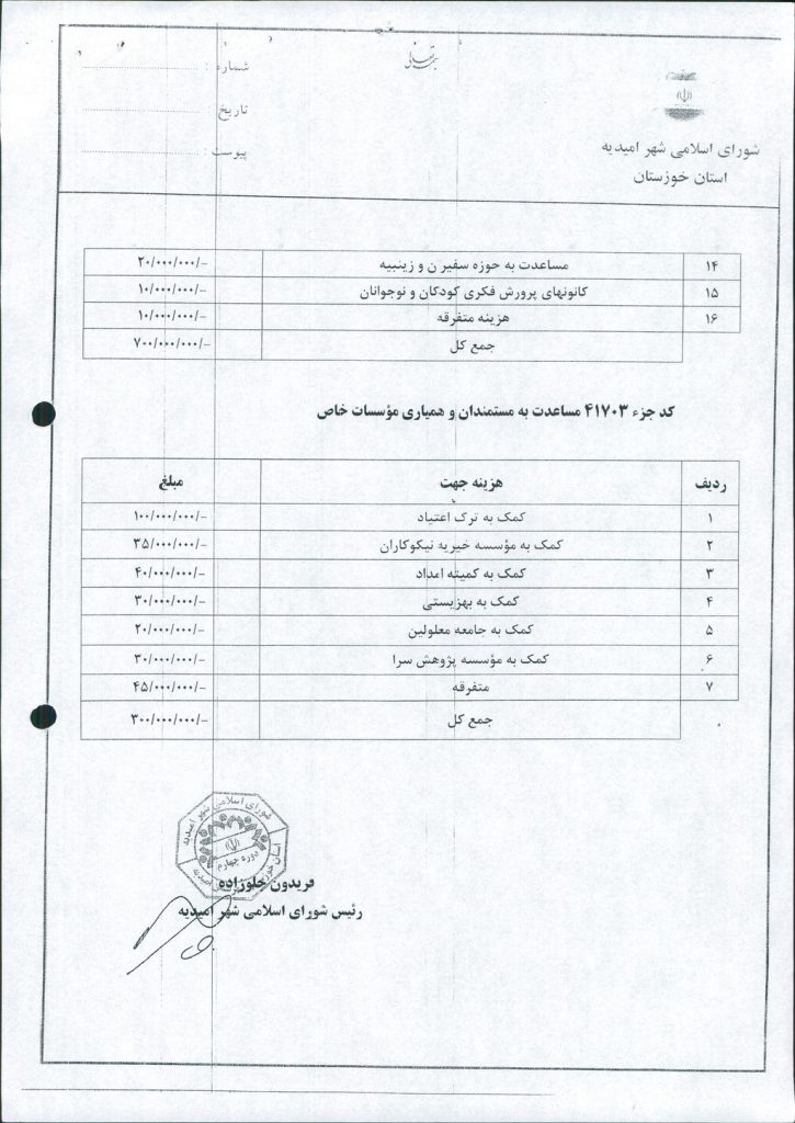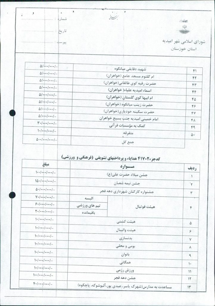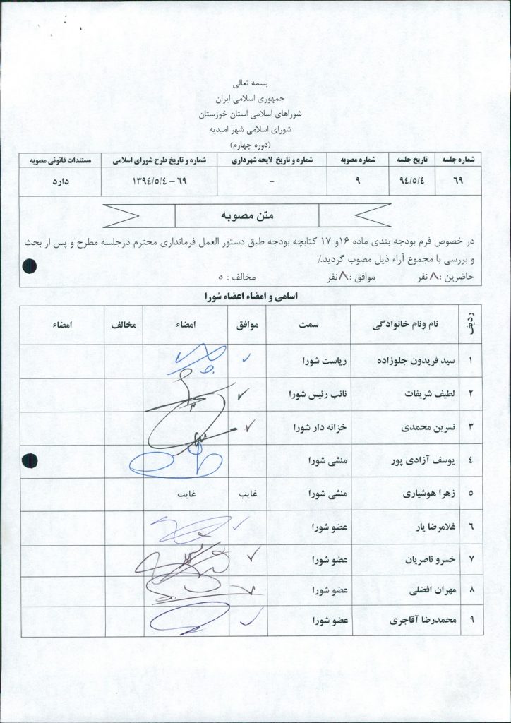 مصوبه شماره ۹ جلسه شماره ۶۹ شورای اسلامی شهر امیدیه
