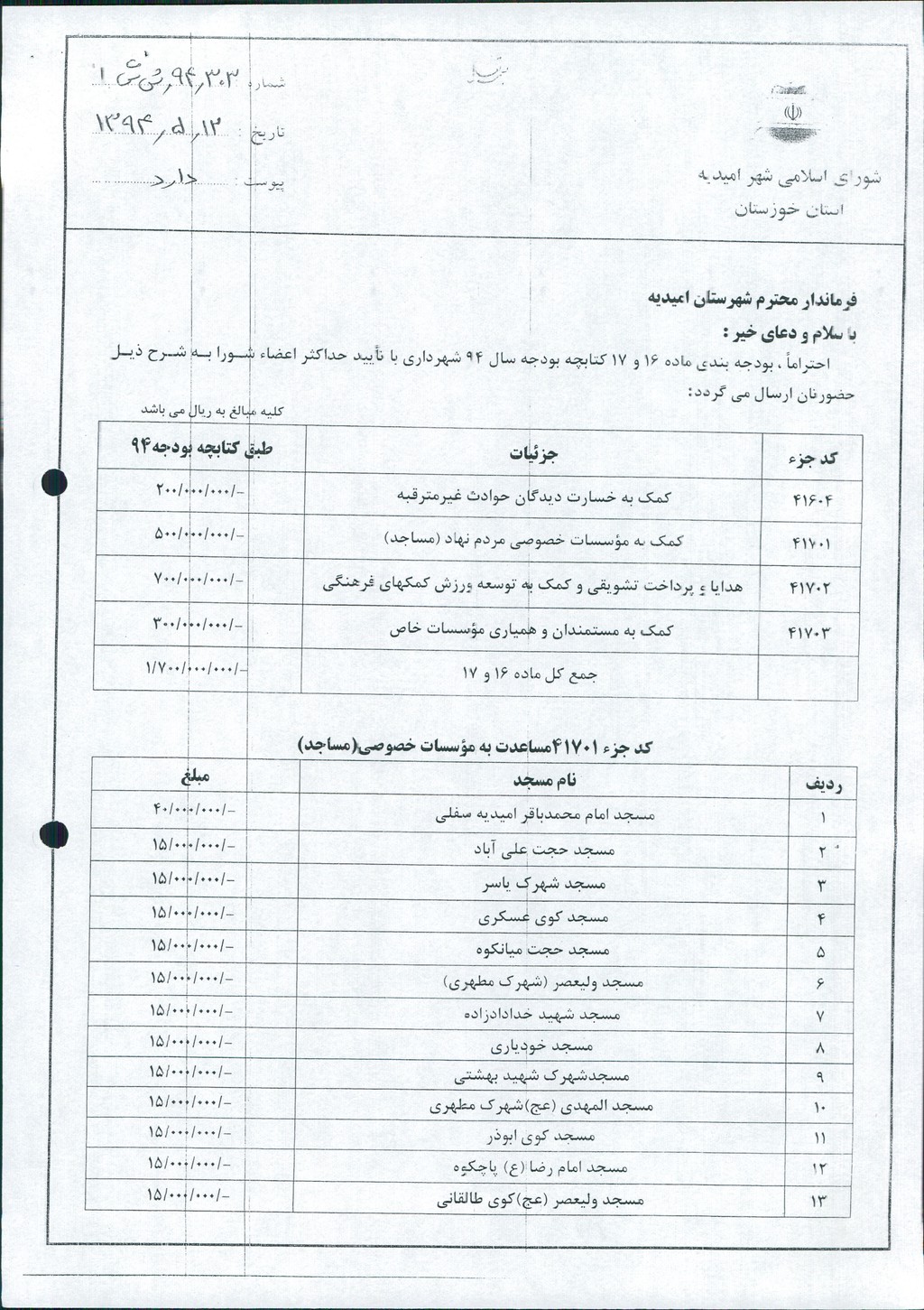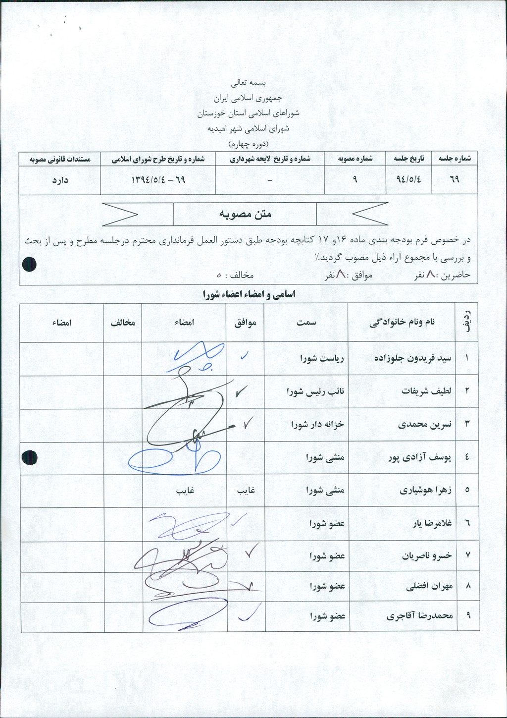 مصوبه شماره ۹ جلسه شماره ۶۹ مورخ ۹۴/۵/۴ شورای اسلامی شهر امیدیه