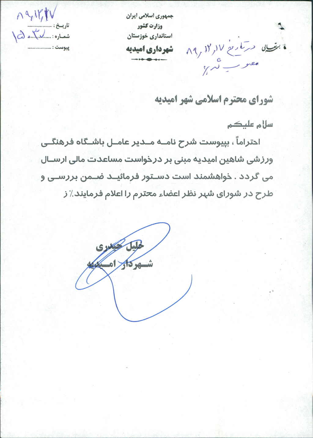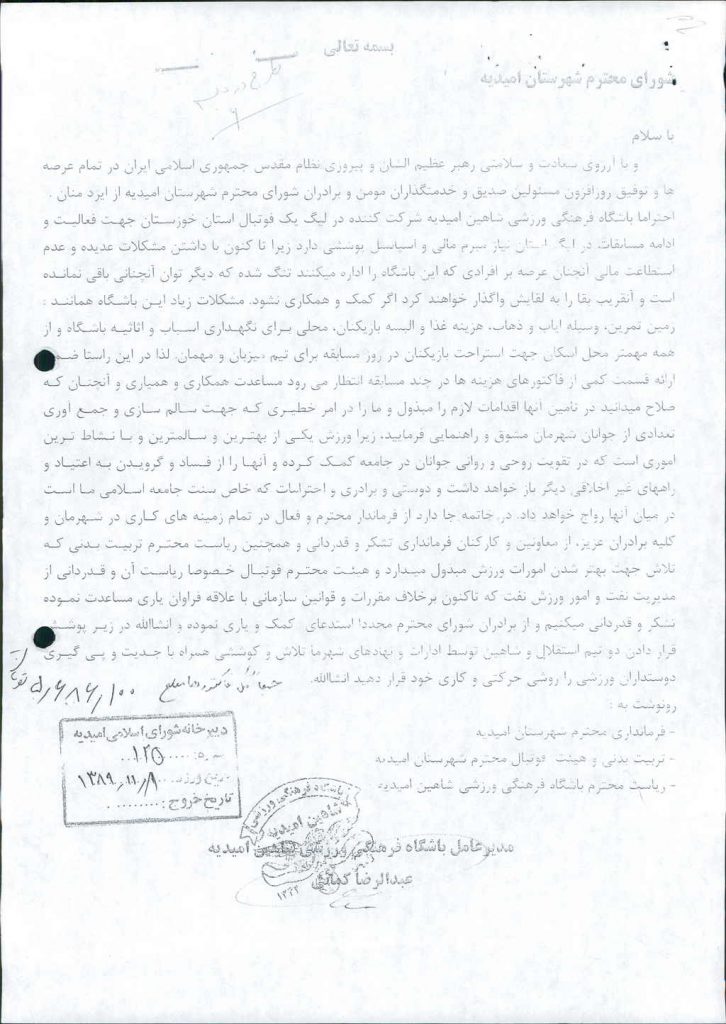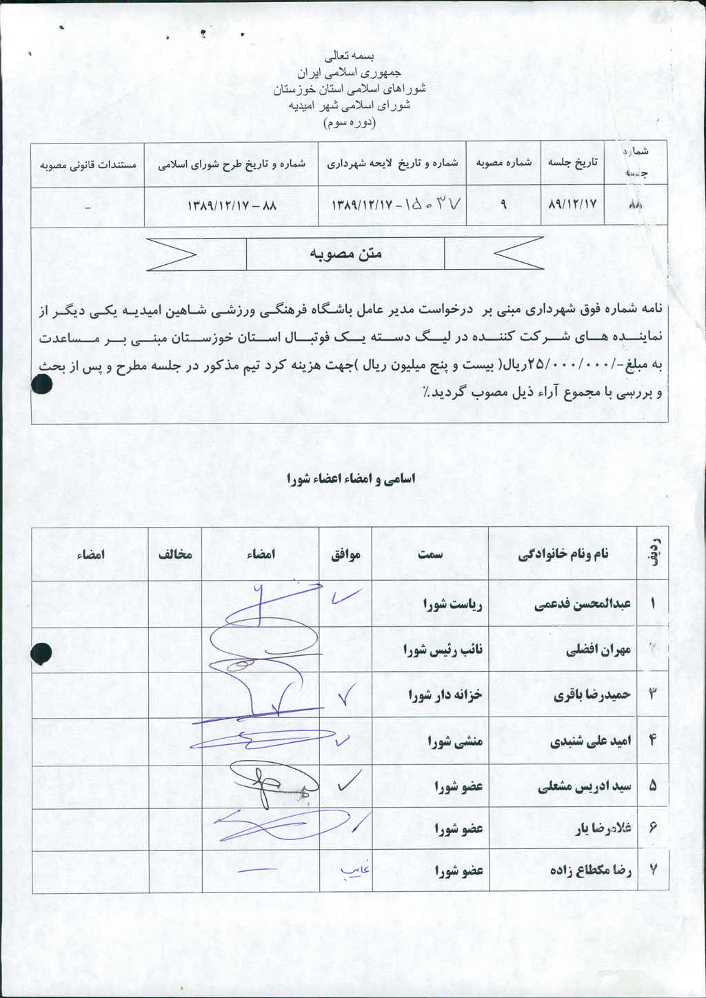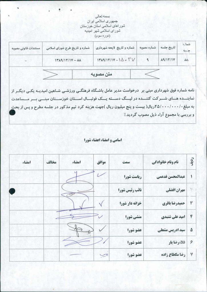 نامه شماره فوق شهرداری مبنی بر درخواست مدیر عامل باشگاه فرهنگی ورزشی شاهین امیدیه یکی دیگر از نماینده های شرکت کننده در لیگ دسته یک فوتبال استان خوزستان مبنی بر مساعدت به مبلغ-/۰۰۰/۰۰۰/ ۲۵ریال( بیست و پنج میلیون ريال )جهت هزینه کرد تیم مذکور در جلسه مطرح و پس از بحث و بررسی با مجموع آراء ذیل مصوب گردید%