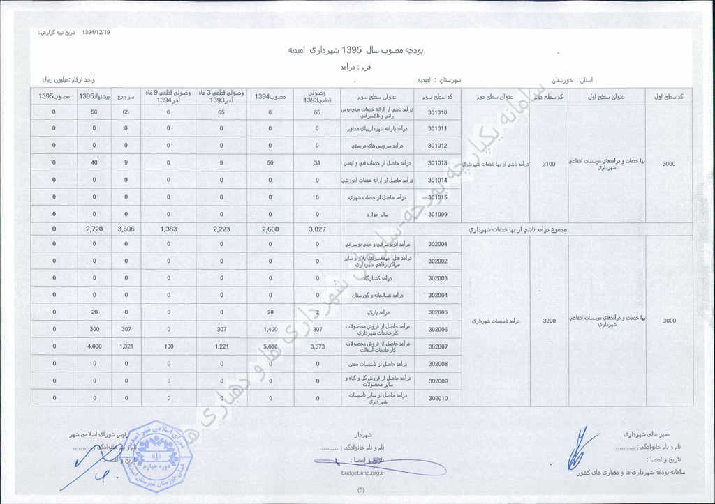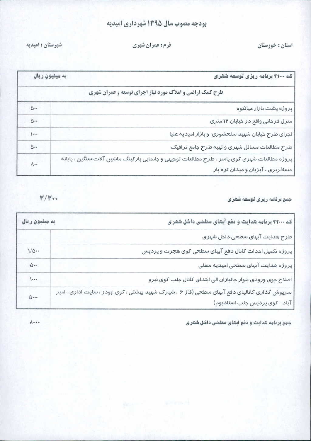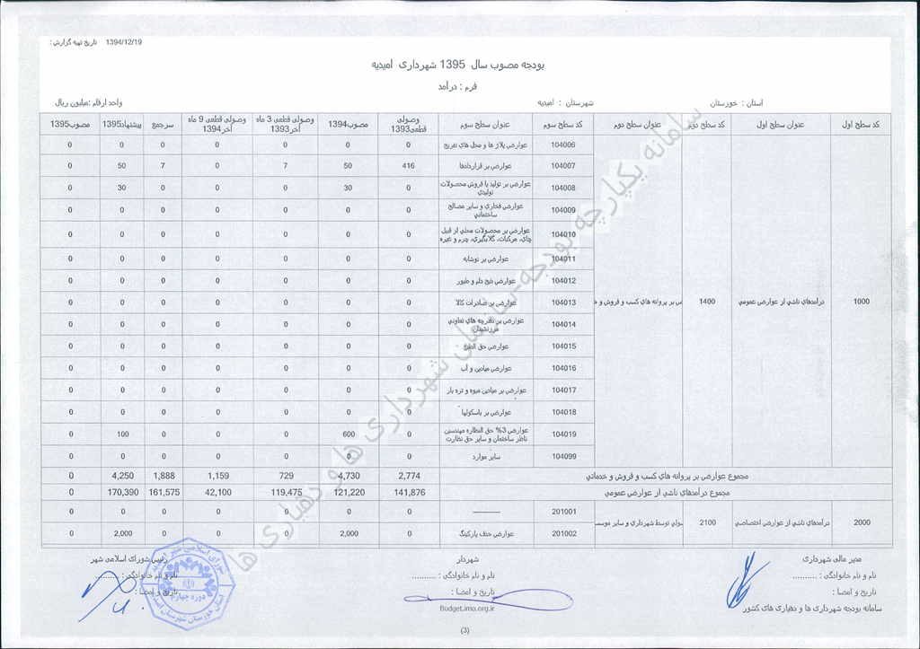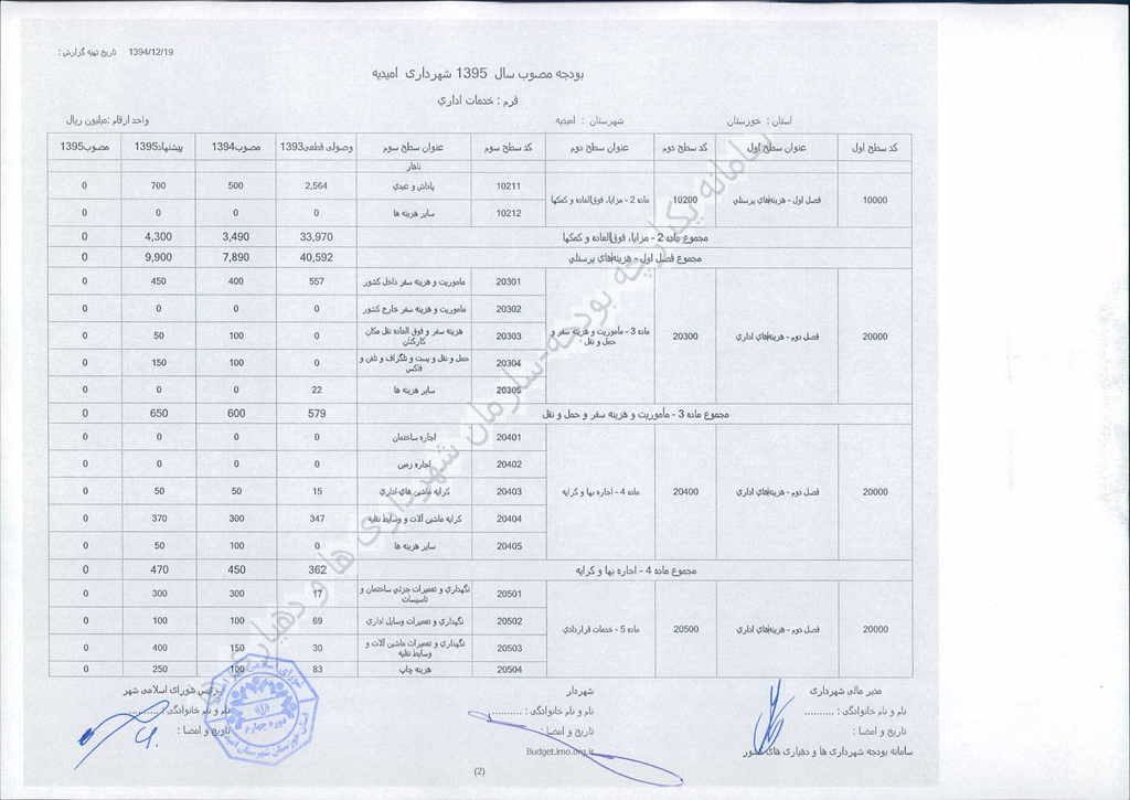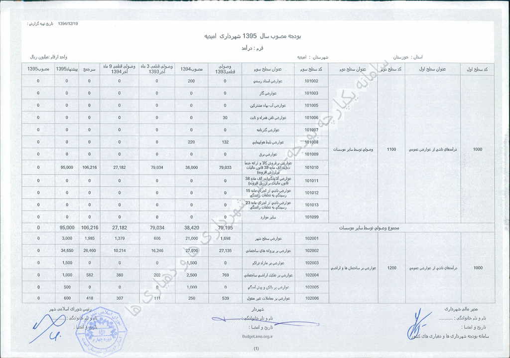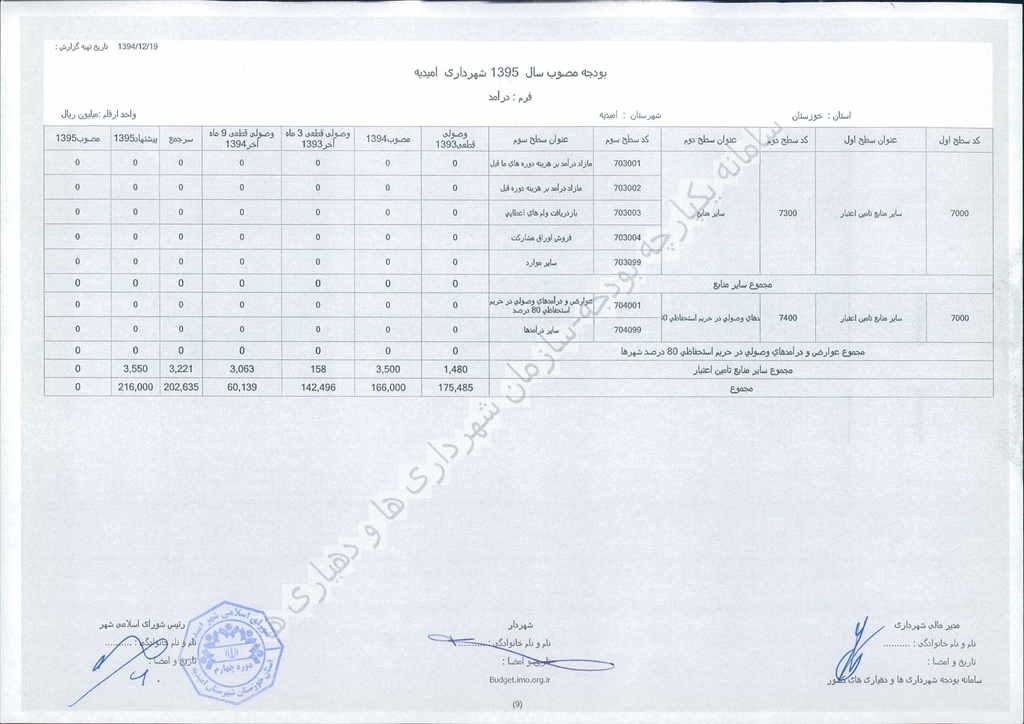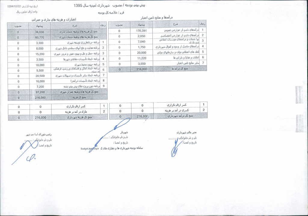 نامه شماره فوق شهرداری مبنی بر بودجه پیشنهادی سال ۱۳۹۵ شهرداری امیدیه به مبلغ -/۰۰۰/۰۰۰/۰۰۰/ ۲۱۶ ریال (دویست و شانزده میلیارد ریال) درجلسه مطرح و پس از بحث و بررسی با مجموع آراء ذیل مصوب گردید%