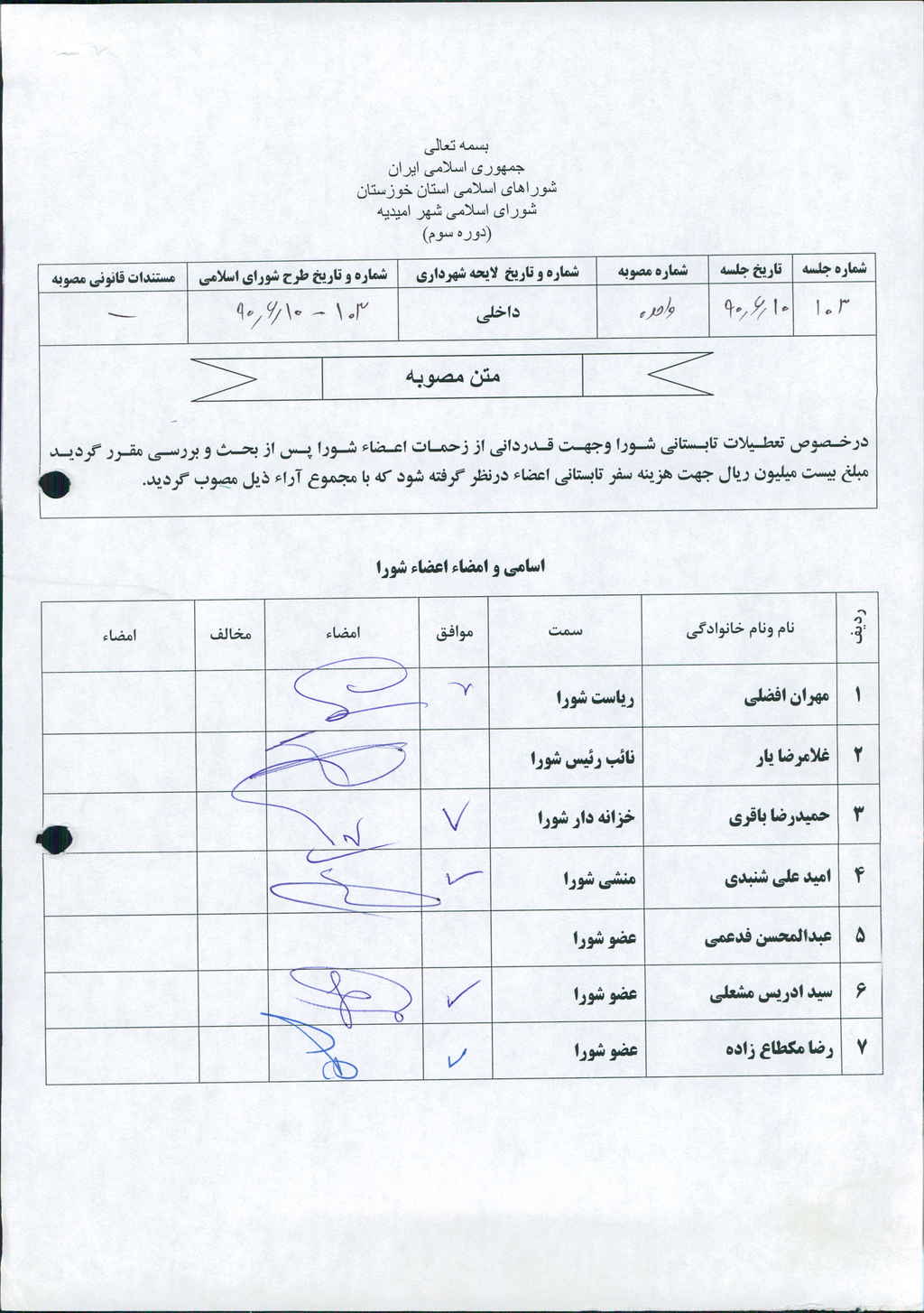 مصوبه واحده جلسه شماره ۱۰۳ شورای اسلامی شهر امیدیه
