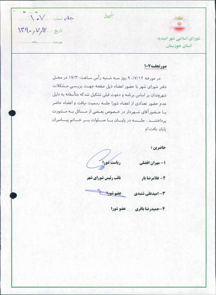 در مورخه ۱۲/ ۷ /۹۰ روز سه شنبه رأس ساعت۳۰/ ۱۷ در محل دفتر شورای شهر با حضور اعضاء ذیل صفحه جهت بررسی مشکلات شهروندان بر اساس برنامه و دعوت قبلی تشکیل شدکه متأسفانه به دلیل عدم حضور تعدادی از اعضاء شورا جلسه رسمیت نیافت و اعضاء حاضر با حضورآقای شهردار در خصوص بعضی از مسائل به مشورت پرداختند . جلسه در پایان با صلوات بر خاتم پیامبران پایان یافت.
