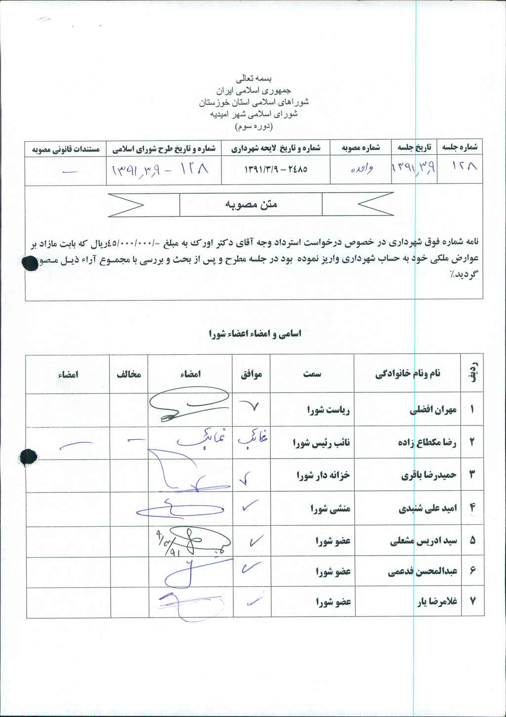 مصوبه واحده جلسه شماره ۱۲۸ شورای اسلامی شهر امیدیه