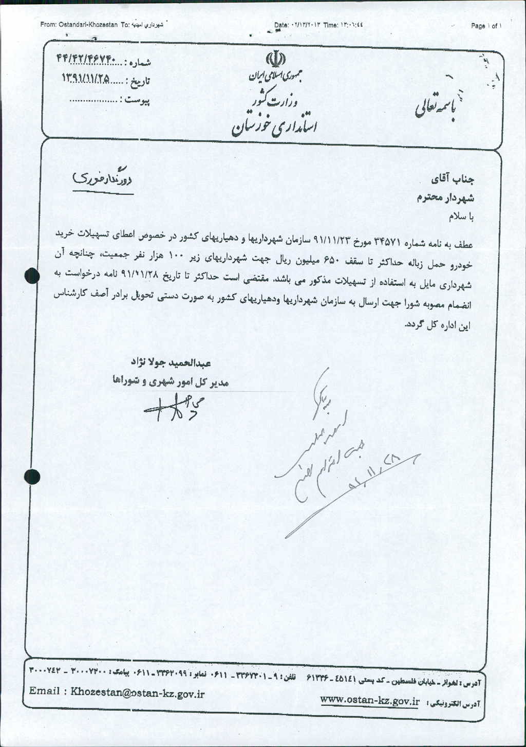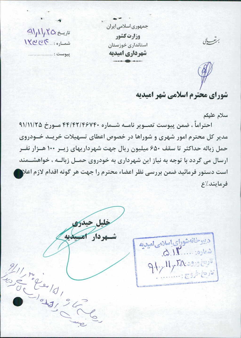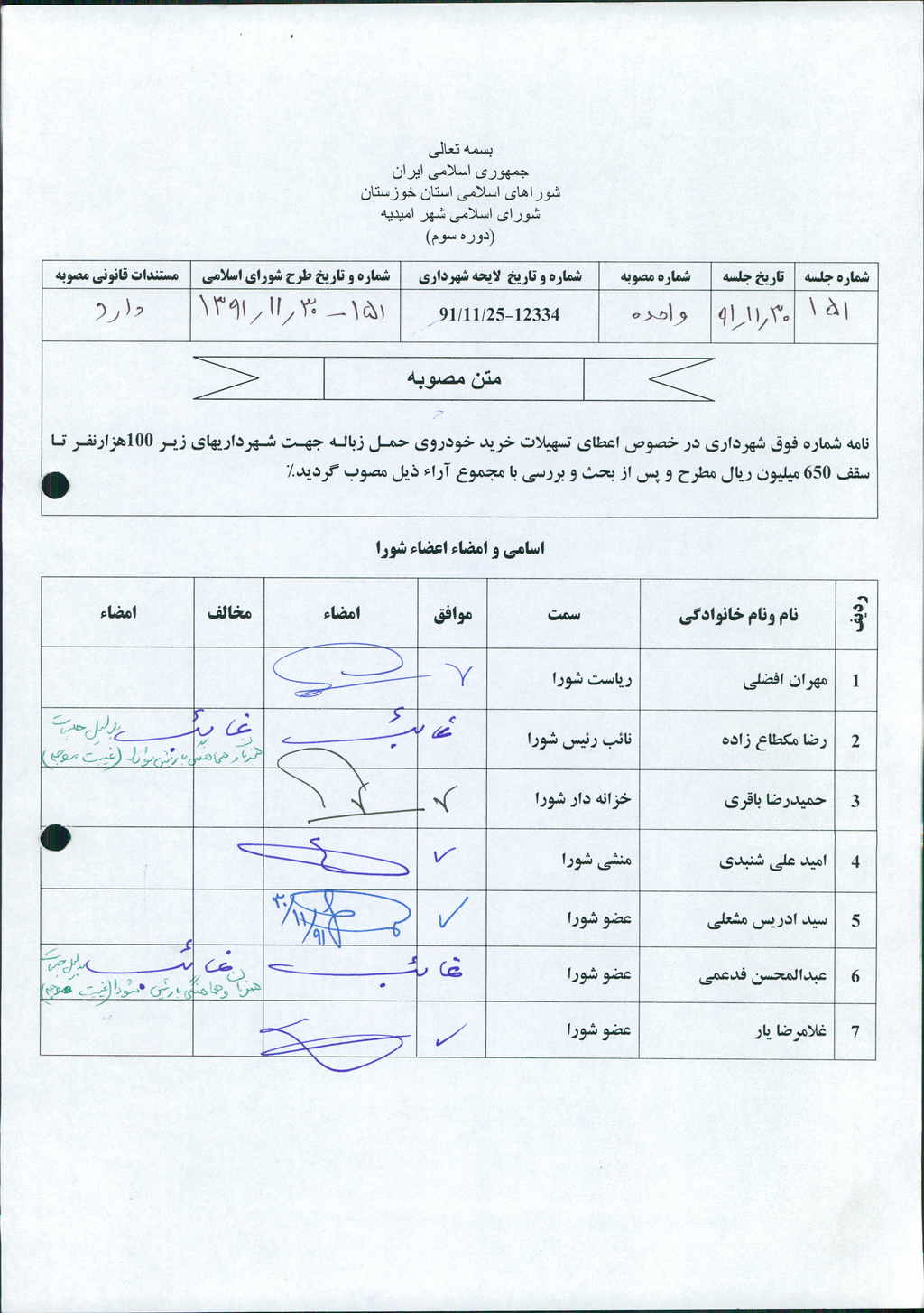 مصوبه واحده جلسه شماره ۱۵۱ مورخ ۹۱/۱۱/۳۰ شورای اسلامی شهر امیدیه