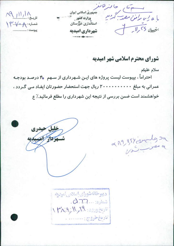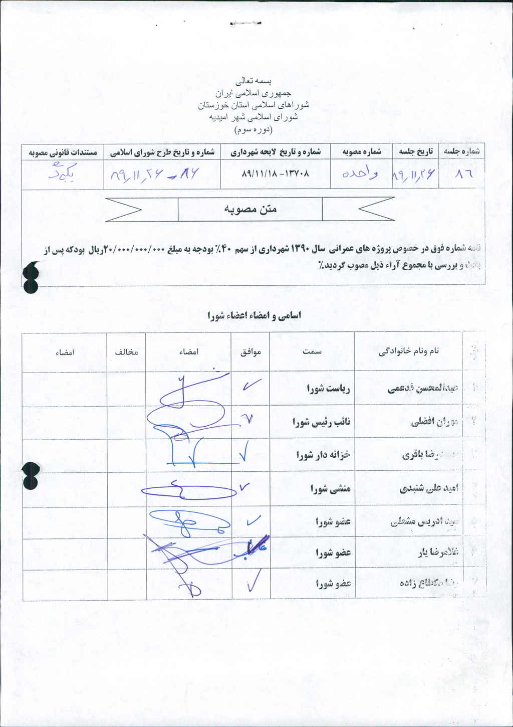 مصوبه واحده جلسه شماره ۸۶ مورخ ۸۹/۱۱/۲۶ شورای اسلامی شهر امیدیه