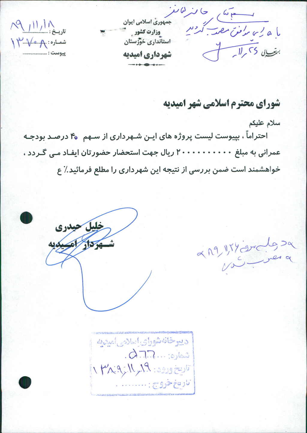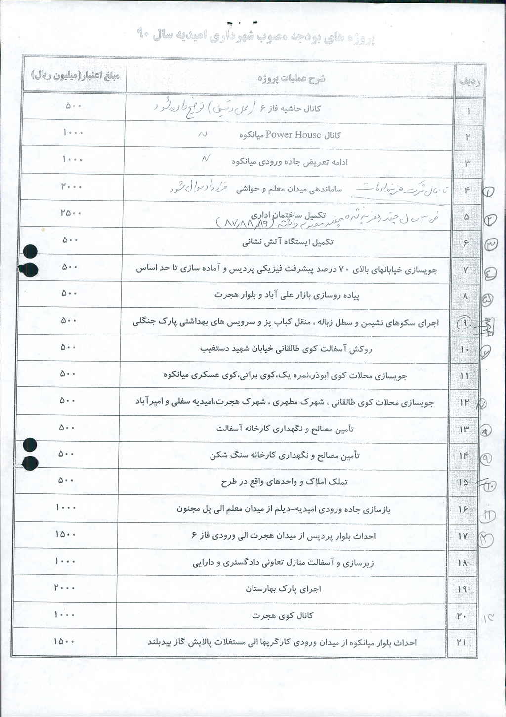 نامه شماره فوق در خصوص پروژه های عمرانی سال ۱۳۹۰شهرداری از سهم ۴۰% بودجه به مبلغ ۲۰/۰۰۰/۰۰۰/۰۰۰ریال بود که پس از بحث و بررسی با مجموع آراء ذیل مصوب گردید%