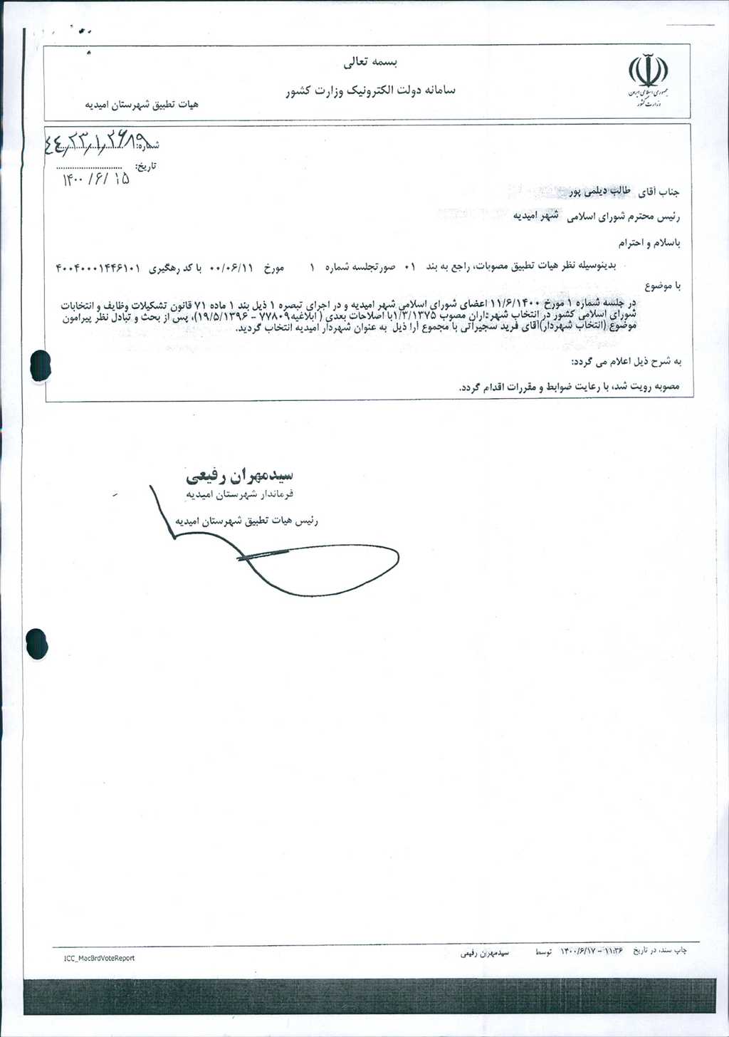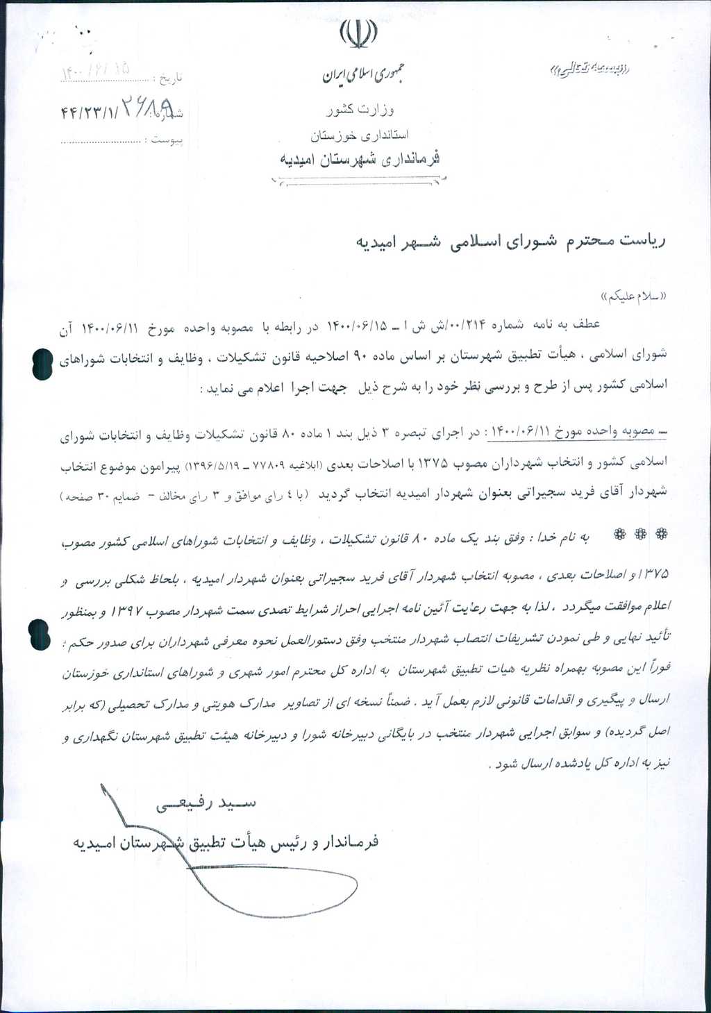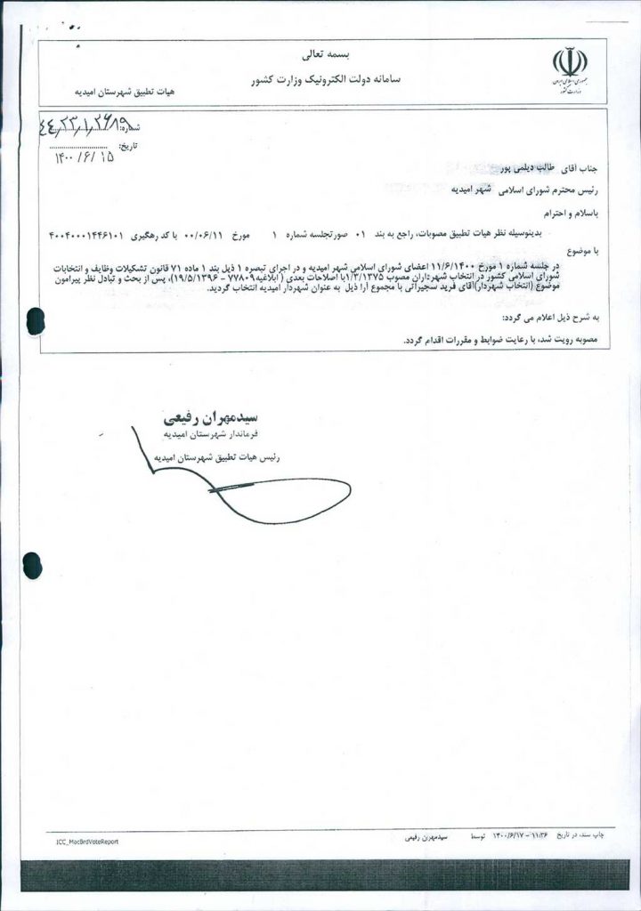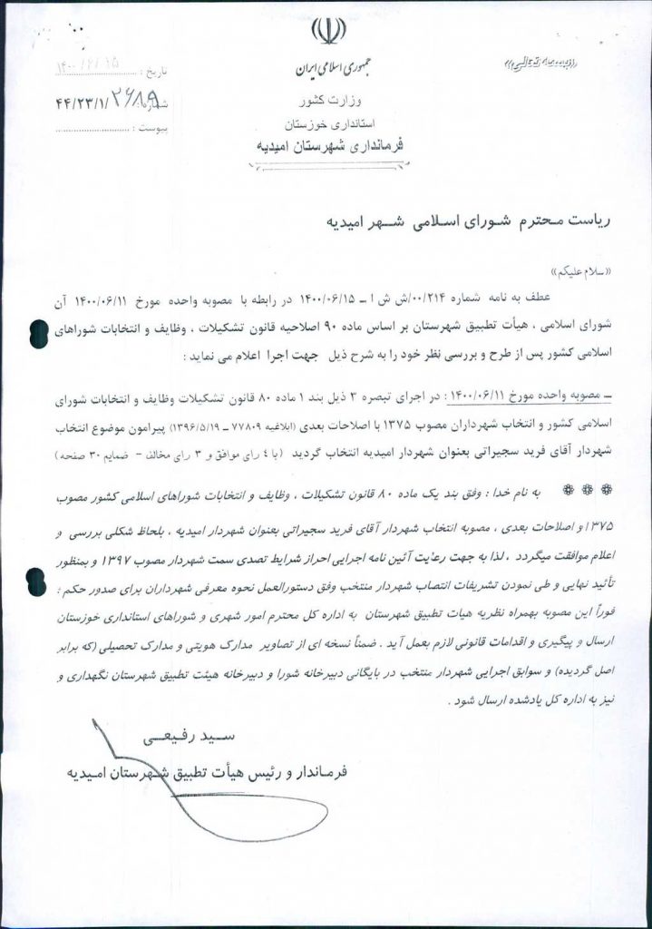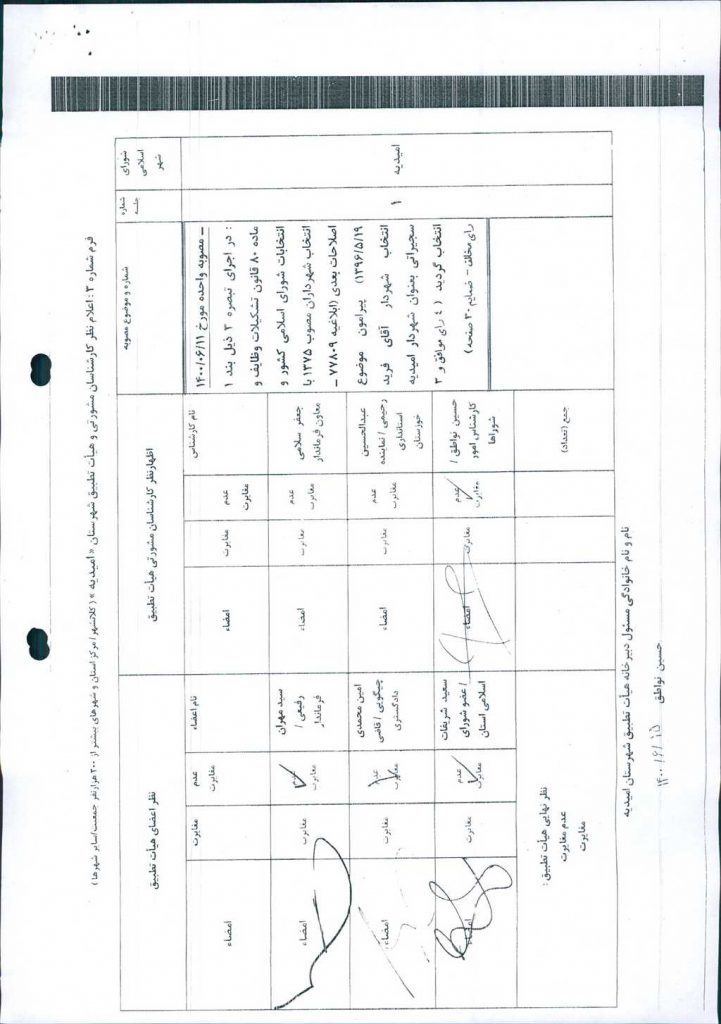 نظریه هیأت تطبیق جلسه شماره ۱ مورخ ۱۴۰۰/۶/۱۱ شورای اسلامی شهر امیدیه