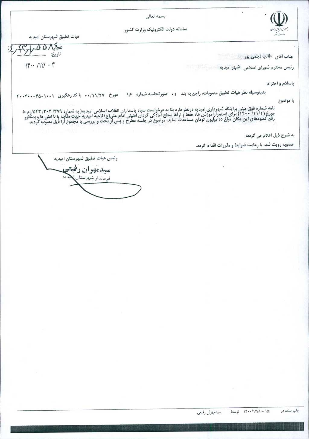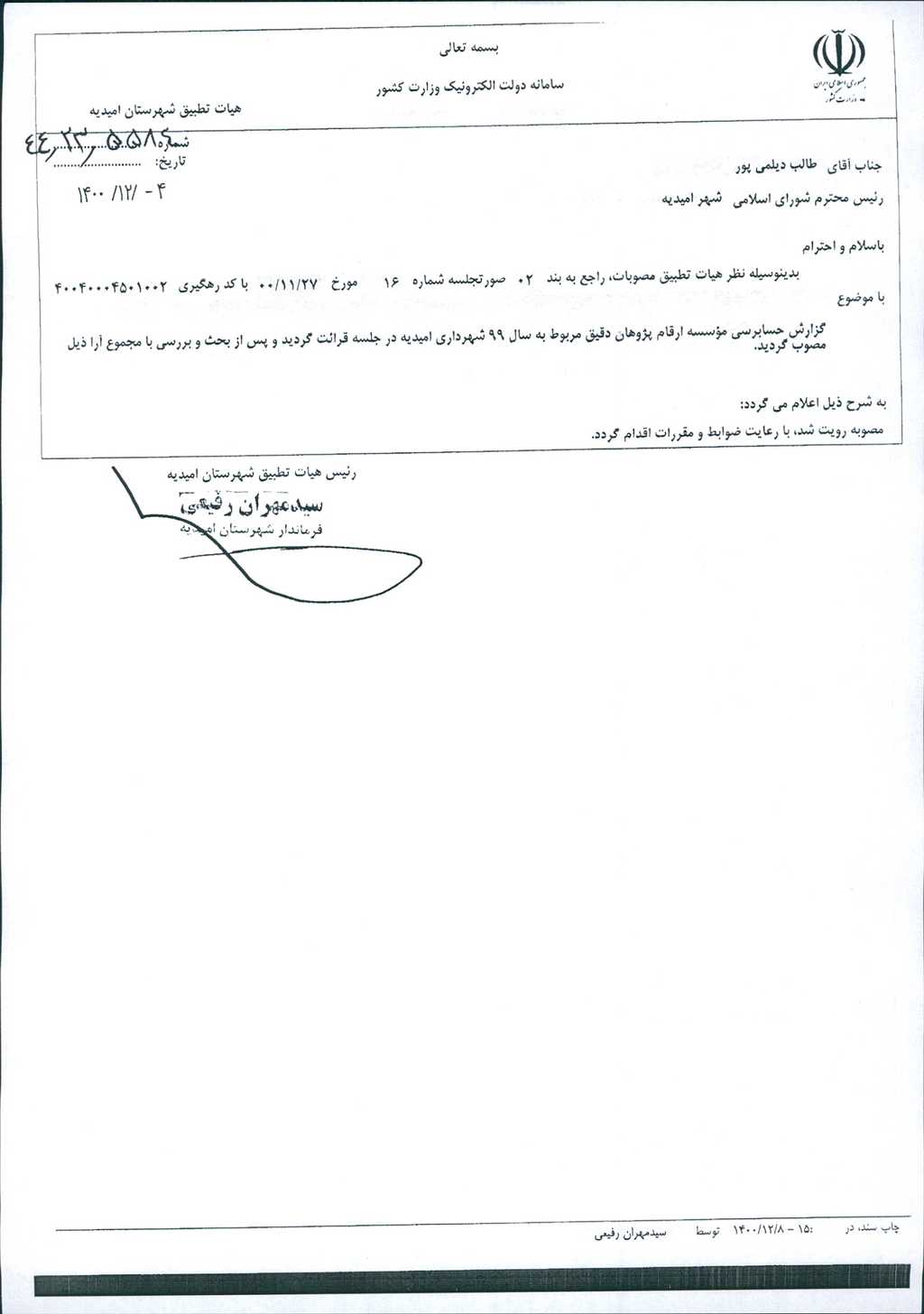 نظریه هیأت تطبیق جلسه شماره ۱۶ مورخ ۱۴۰۰/۱۱/۲۷ شورای اسلامی شهر امیدیه