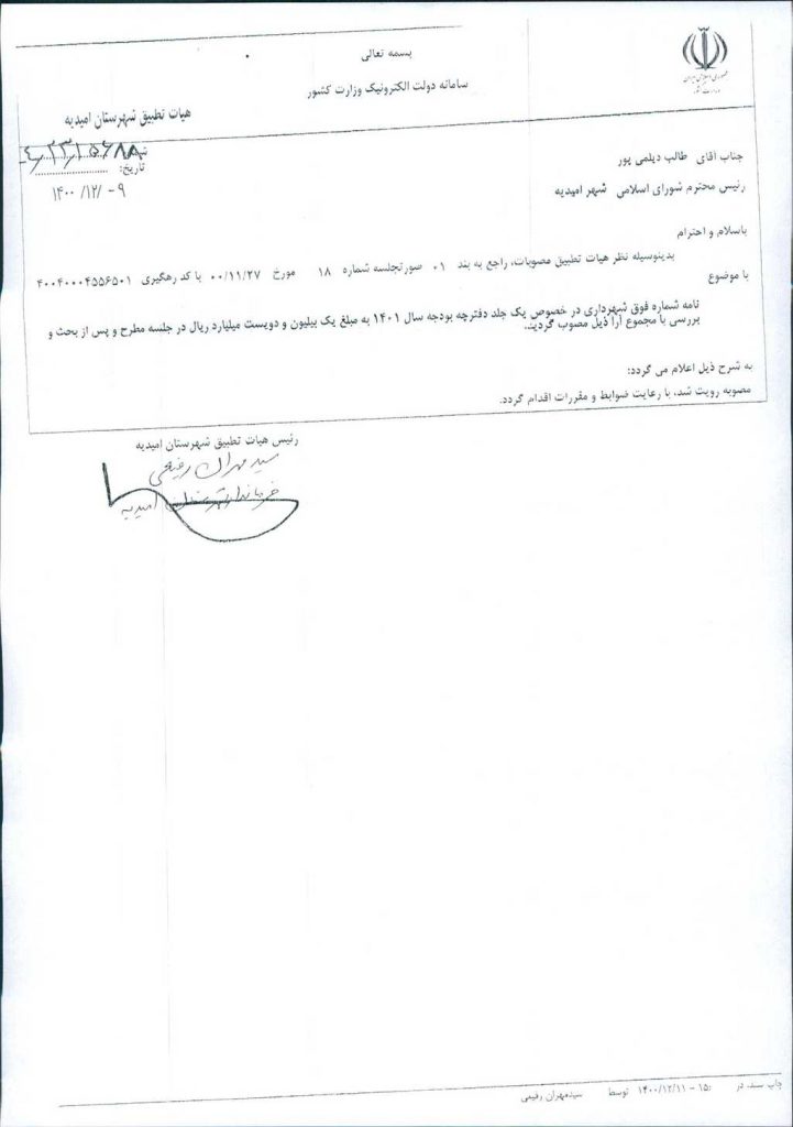نظریه هیأت تطبیق جلسه شماره ۱۸ مورخ ۱۴۰۰/۱۱/۲۷ شورای اسلامی شهر امیدیه