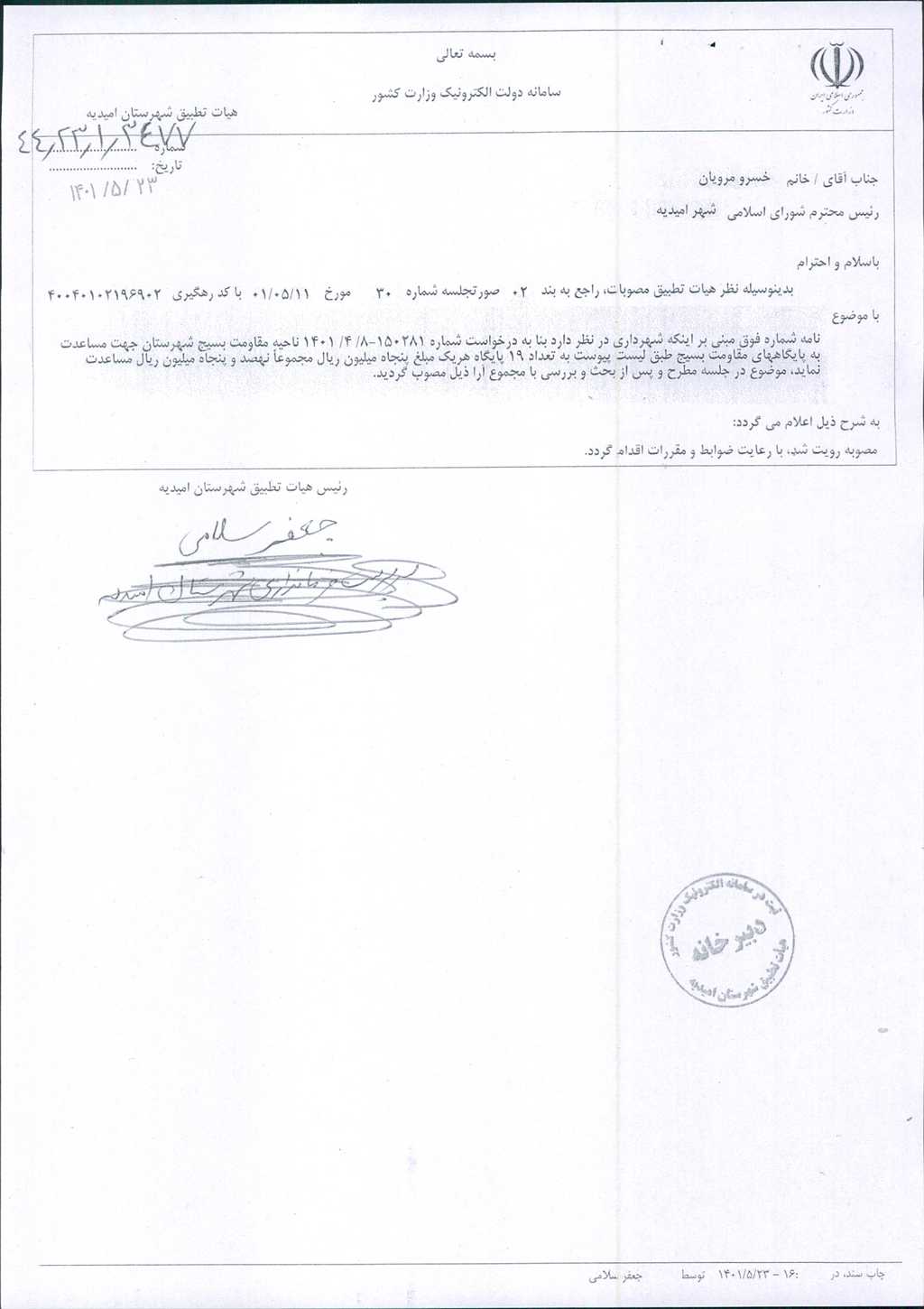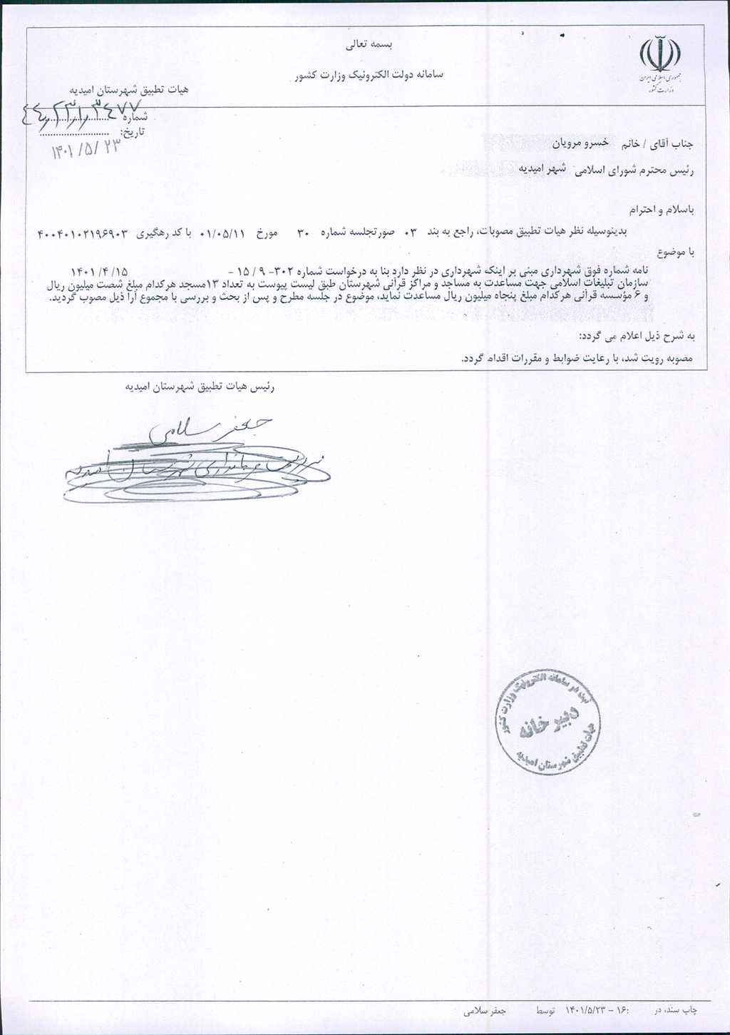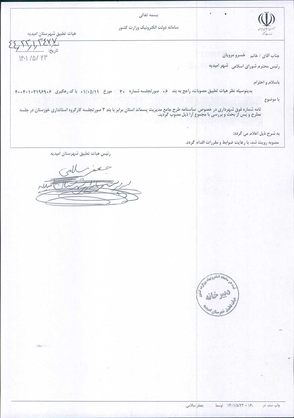 نظریه هیأت تطبیق جلسه شماره ۳۰ مورخ ۱۴۰۱/۵/۱۱ شورای اسلامی شهر امیدیه