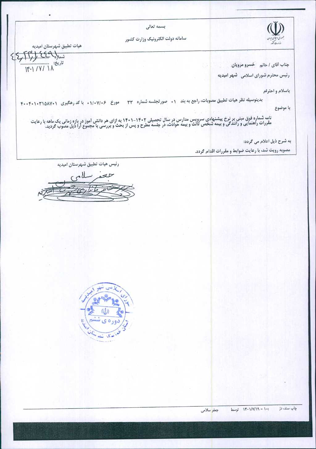 نظریه هیأت تطبیق جلسه شماره ۳۳ مورخ ۱۴۰۱/۷/۶ شورای اسلامی شهر امیدیه