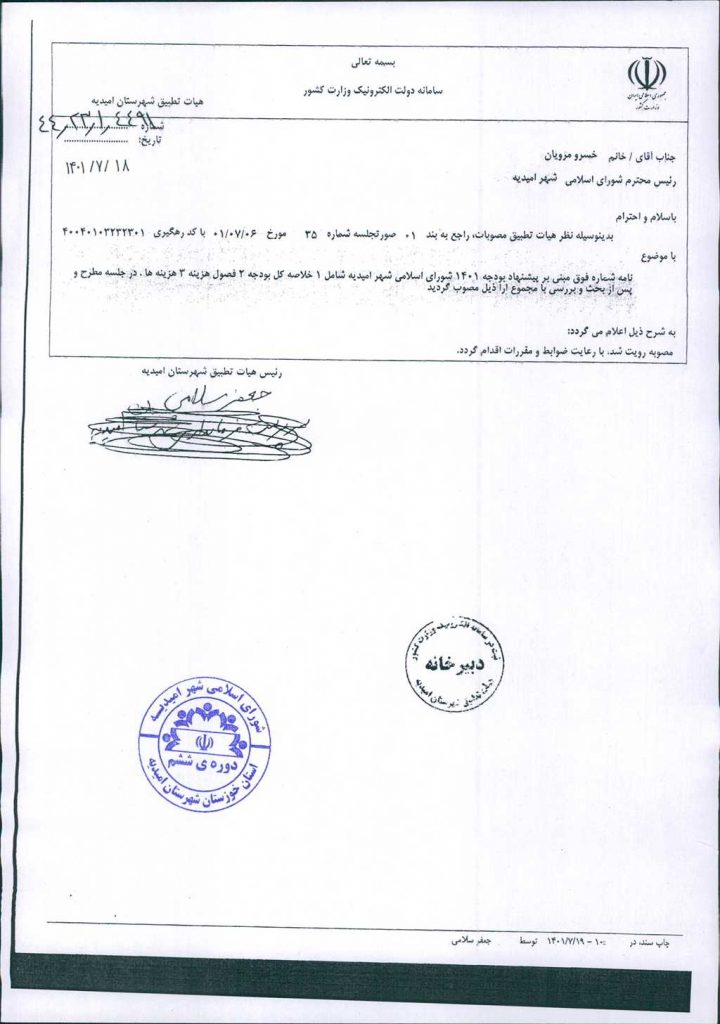 نظریه هیأت تطبیق جلسه شماره ۳۵ مورخ ۱۴۰۱/۷/۶ شورای اسلامی شهر امیدیه