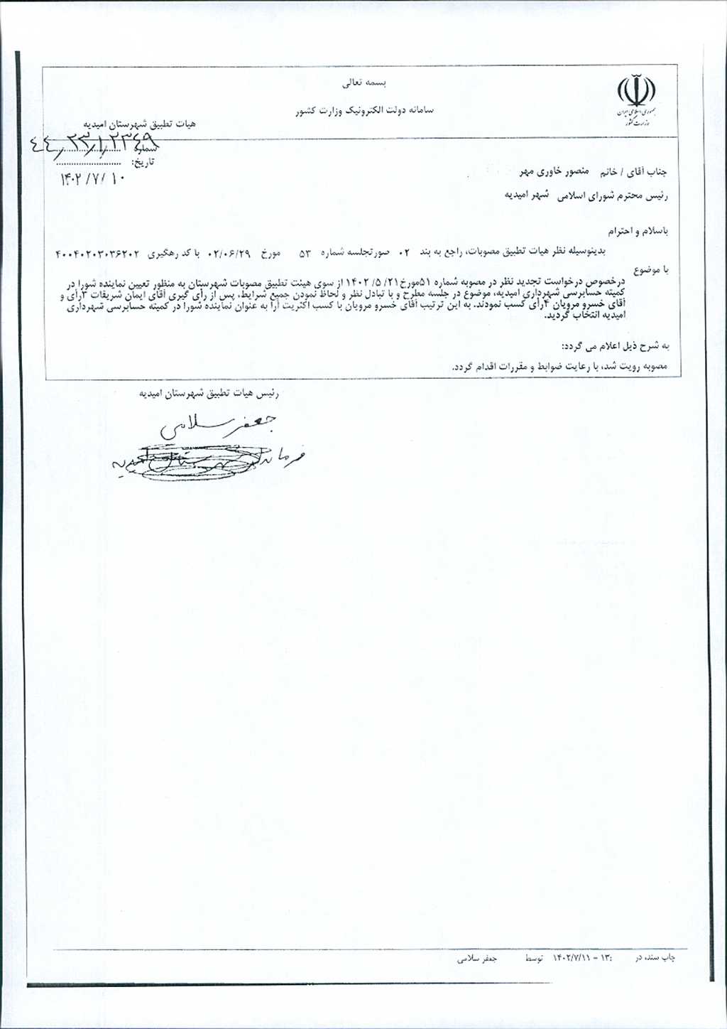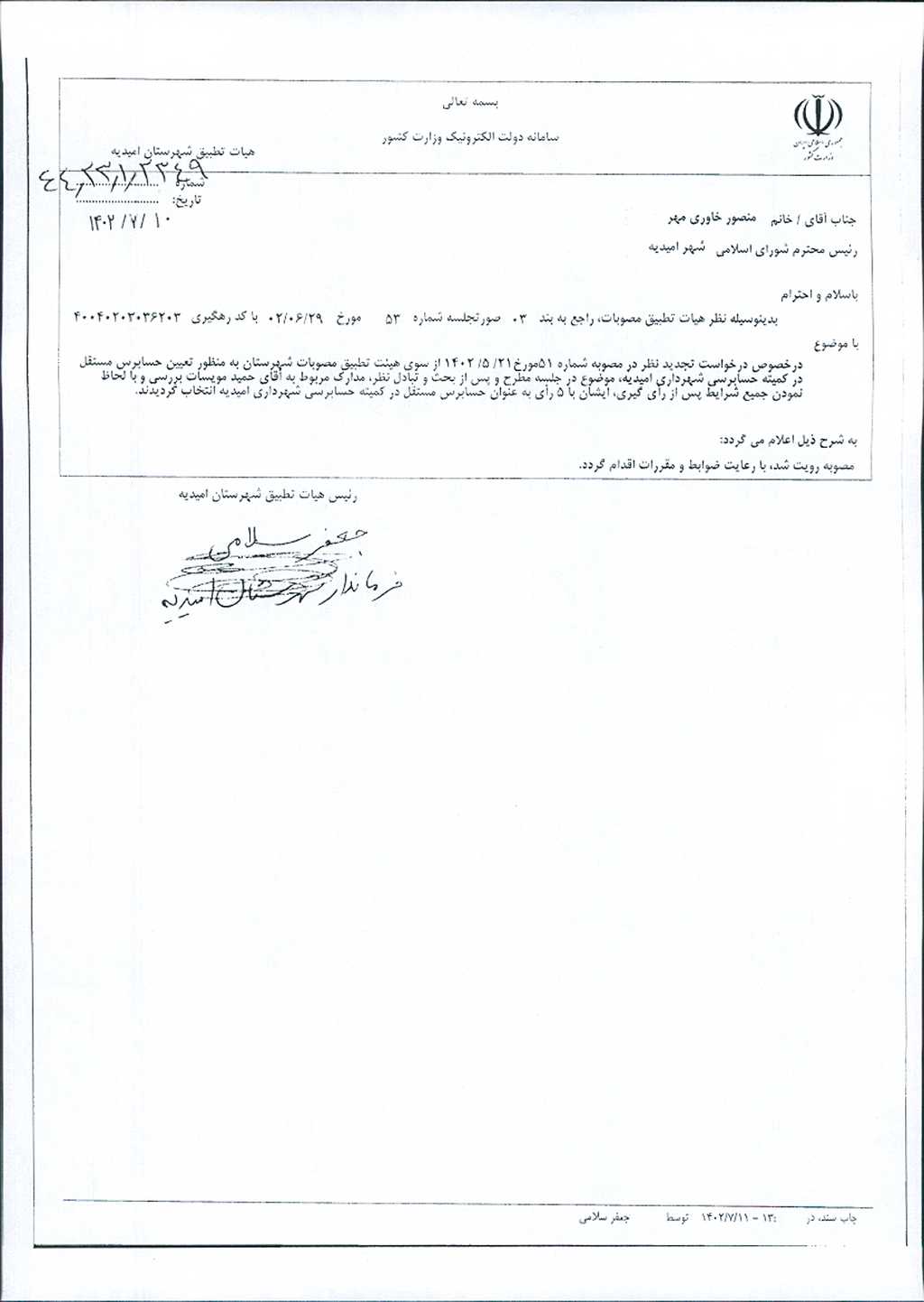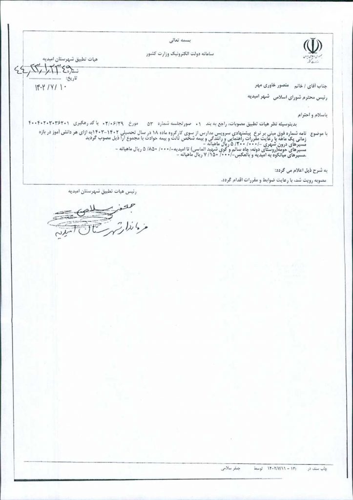 نظریه هیأت تطبیق جلسه شماره ۵۳ مورخ ۱۴۰۲/۰۶/۲۹ شورای اسلامی شهر امیدیه